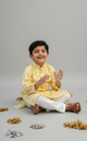 Bring home the freshness of nature with our Chhota Hariyali Kurta Set. Designed in a soothing green with golden highlights and paired with classic white trousers, this outfit blends festive sparkle with everyday comfort. Perfect for weddings, pujas, or playful family gatherings—it's a joyful choice for your little one to look stylish and feel at ease.