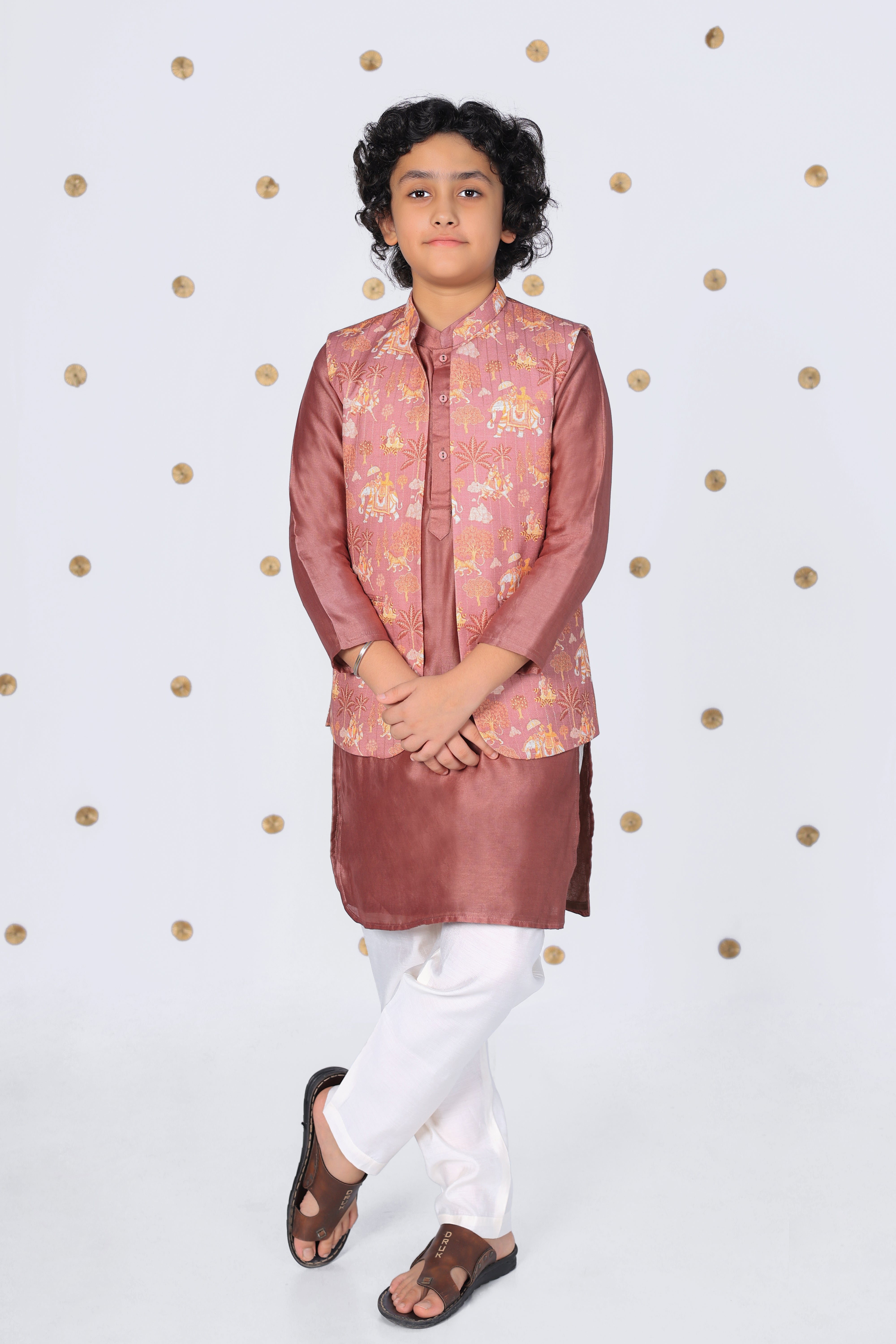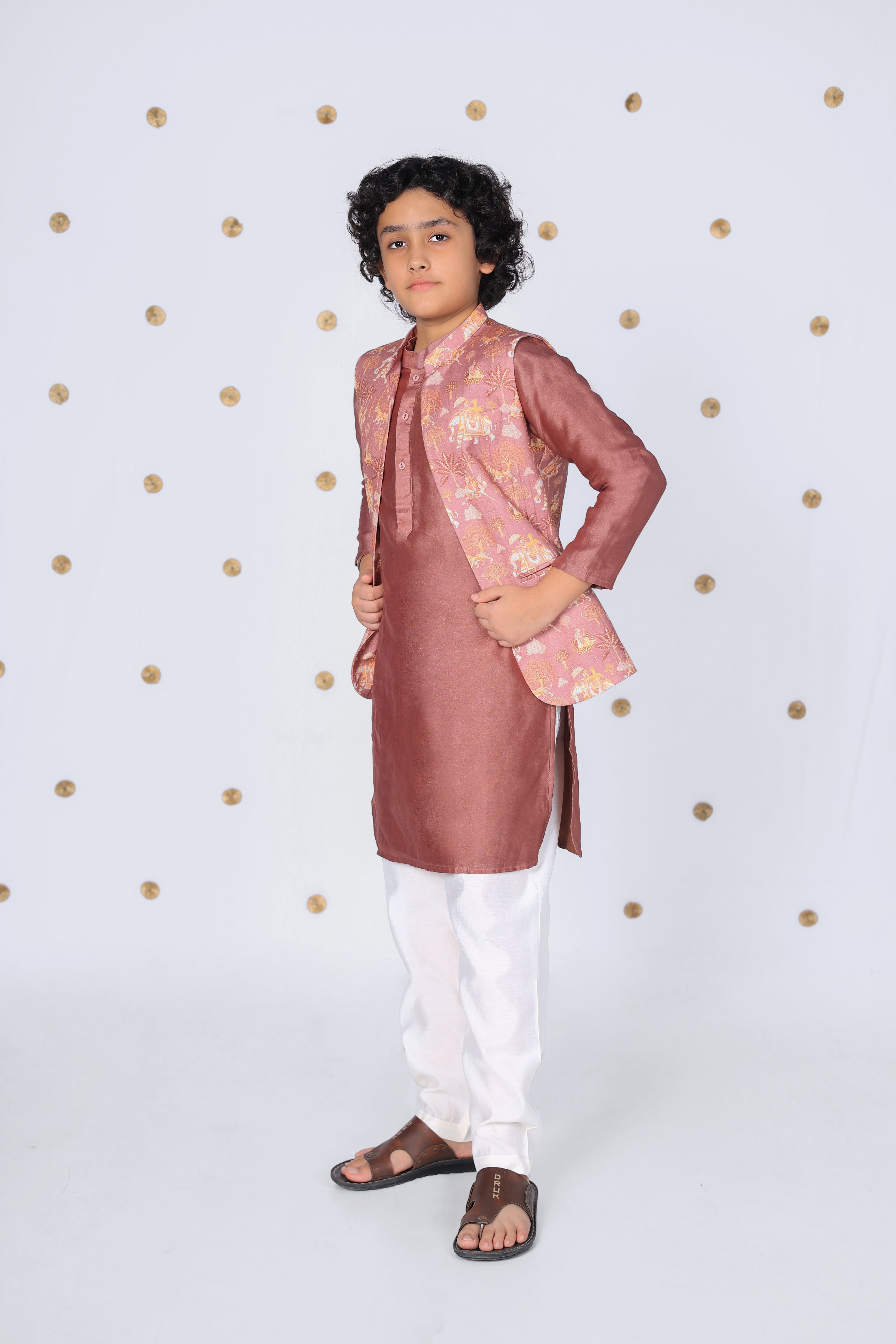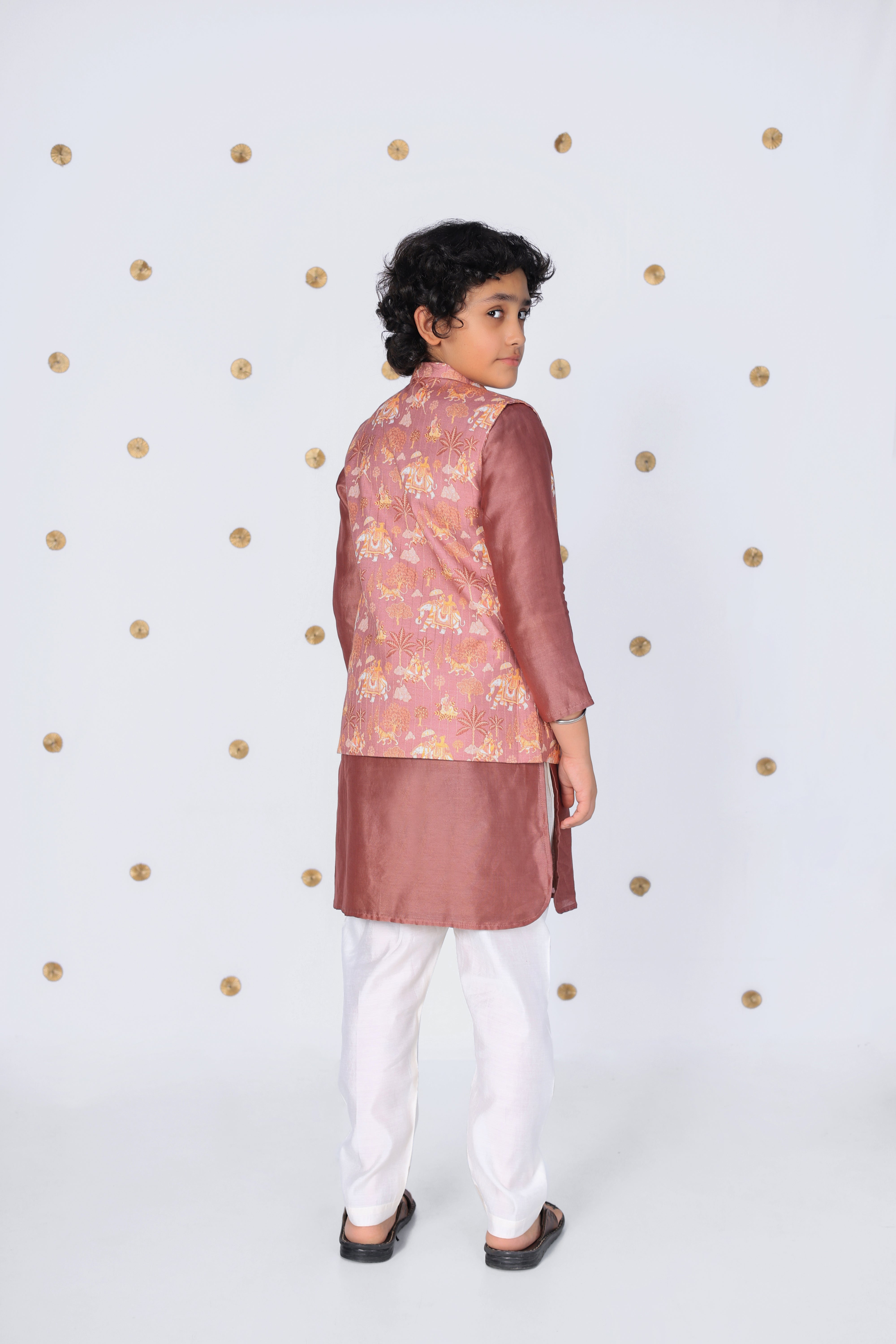 Boys Silk Kurta with Printed Nehru Jacket and Pajama