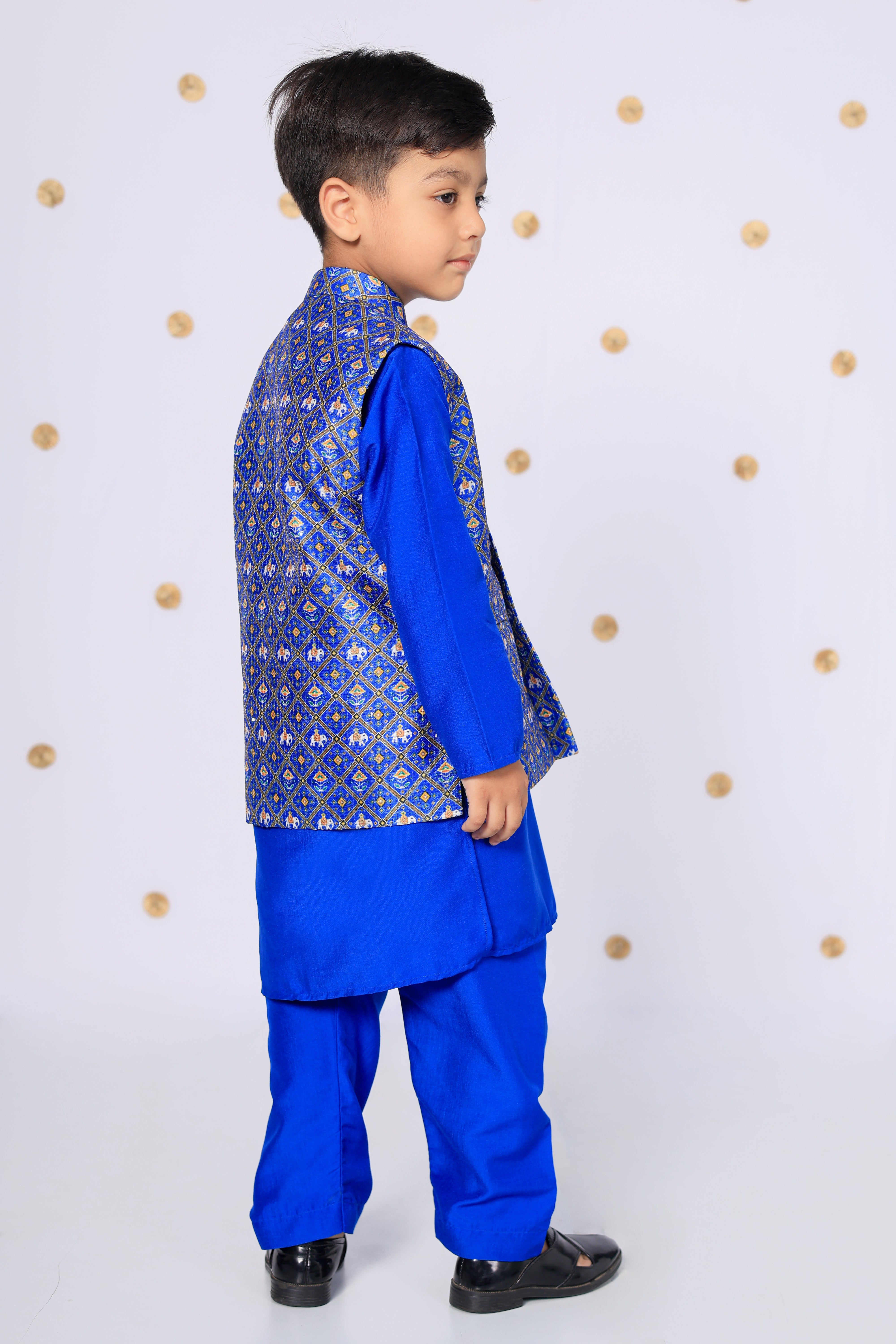 Make festive dressing fun and stylish with our Royal Blue Elephant Motif Jacket Set. This outfit comes with a vibrant blue kurta and pants paired with a patterned Nehru jacket featuring intricate elephant and traditional motifs. The rich color and playful print strike the perfect balance between tradition and charm, making it ideal for weddings, festivals, and family celebrations.
