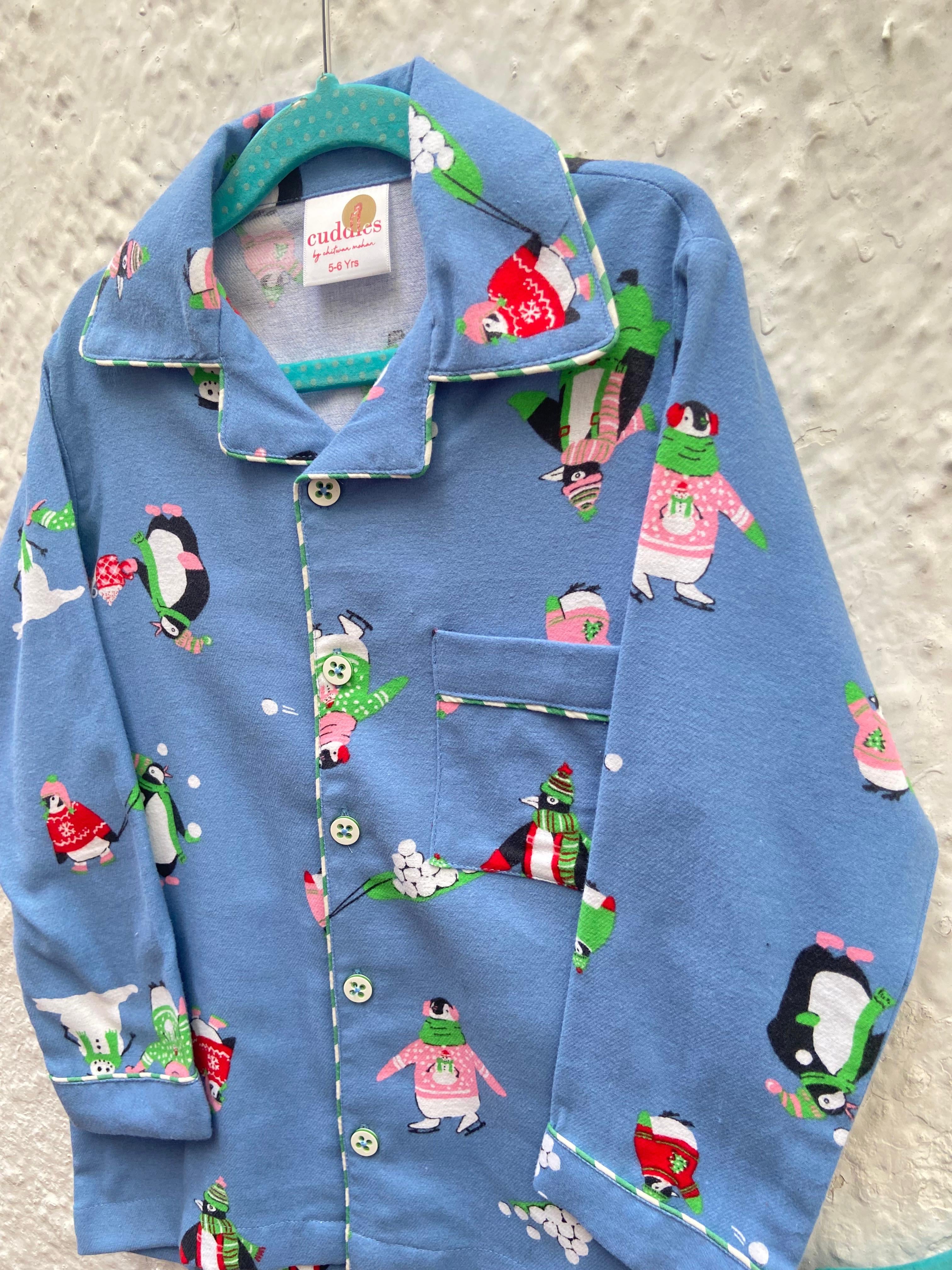 The long-sleeved shirt has a classic button-down front with sweet white piping detail and a handy little chest pocket. The matching pants have an easy elastic waist, perfect for quick changes and ultimate comfort. Made from soft, breathable fabric, these PJs are perfect for snuggling up to read a book, enjoying a bowl of hot cocoa, or dreaming of snowy playdates.