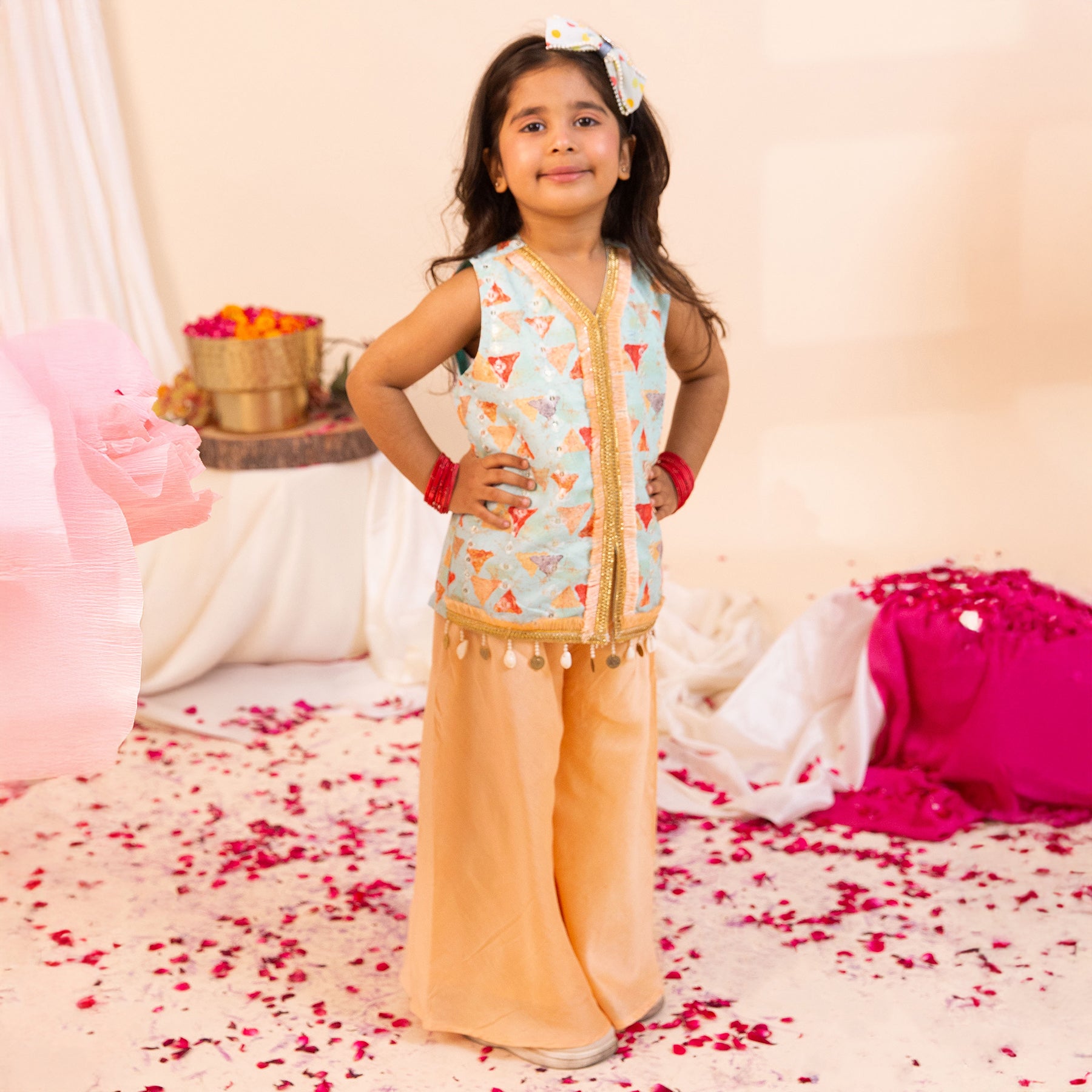 Full of festive flair and modern elegance, the Nazakat Set is a delightful choice for special occasions. The sleeveless, front-open jacket features a striking geometric print and playful tassels that hang beautifully at the hemline — adding charm and movement to every step. Paired with flared organza bottoms, lined with soft mul mul for extra comfort, this outfit is designed for your little one to twirl, play, and shine through the celebrations.