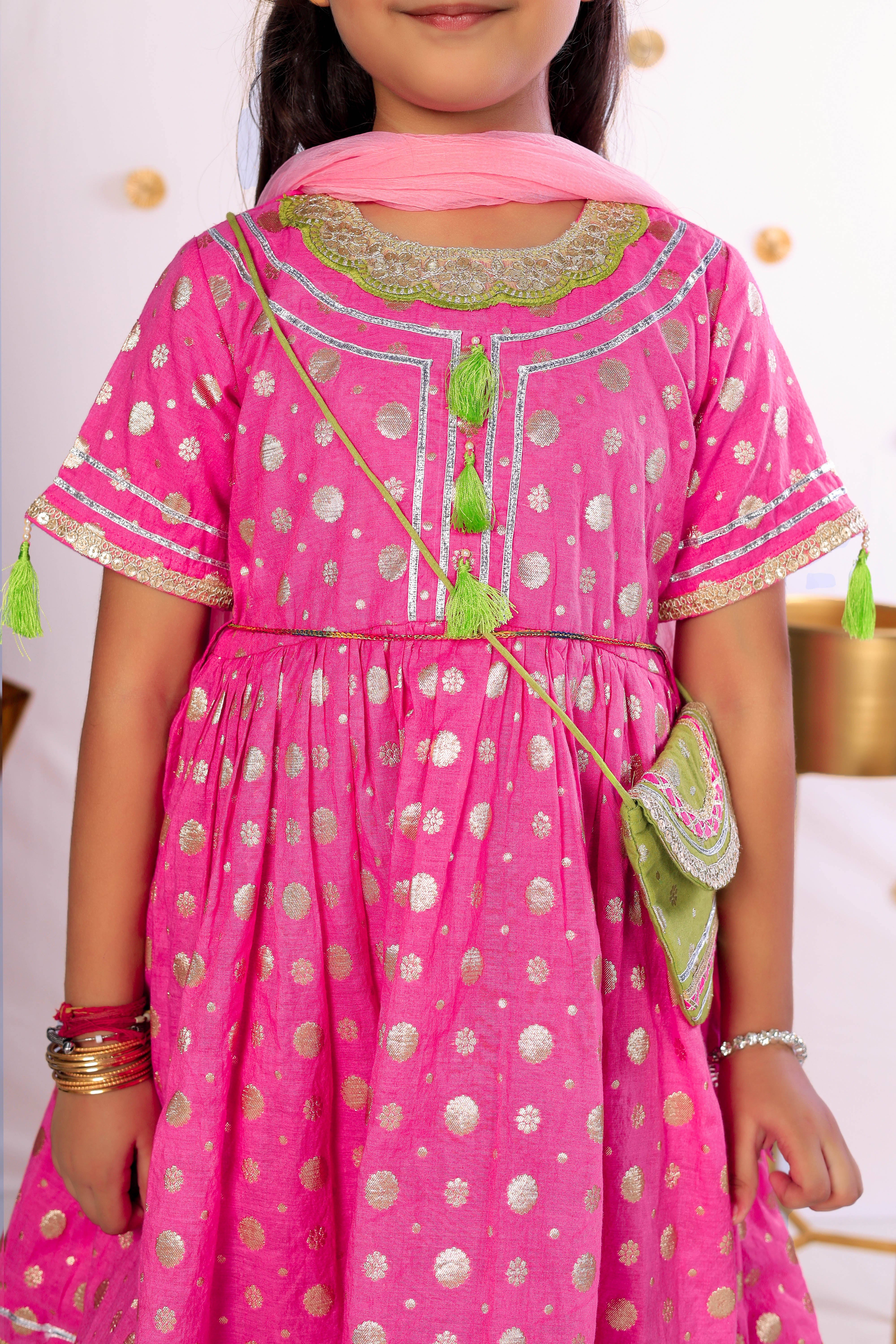 A festive delight in mul chanderi, this pink kurta set is adorned with golden butis, tassel detailing, and a contrasting green sharara. Paired with a soft dupatta and a cute potli, it’s a perfect blend of comfort and charm for little stars to shine bright this season.