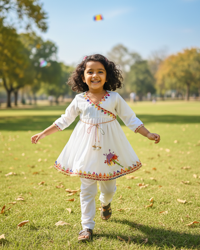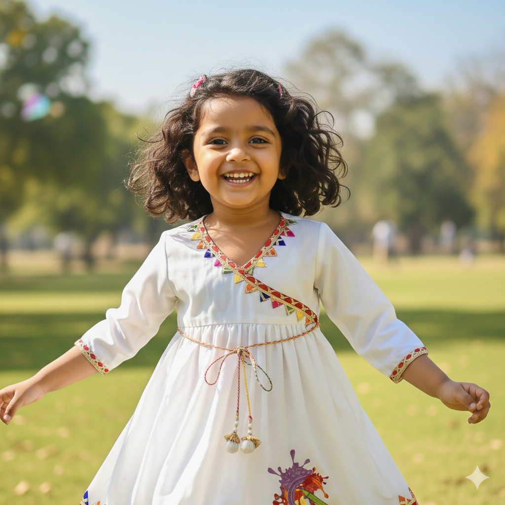 Introducing our enchanting White Embroidered Angrakha Style Anarkali for kids, specially crafted to infuse the joy and spirit of Holi into their celebrations. This delightful ensemble combines timeless elegance with playful accents, perfect for embracing the festive fervor.