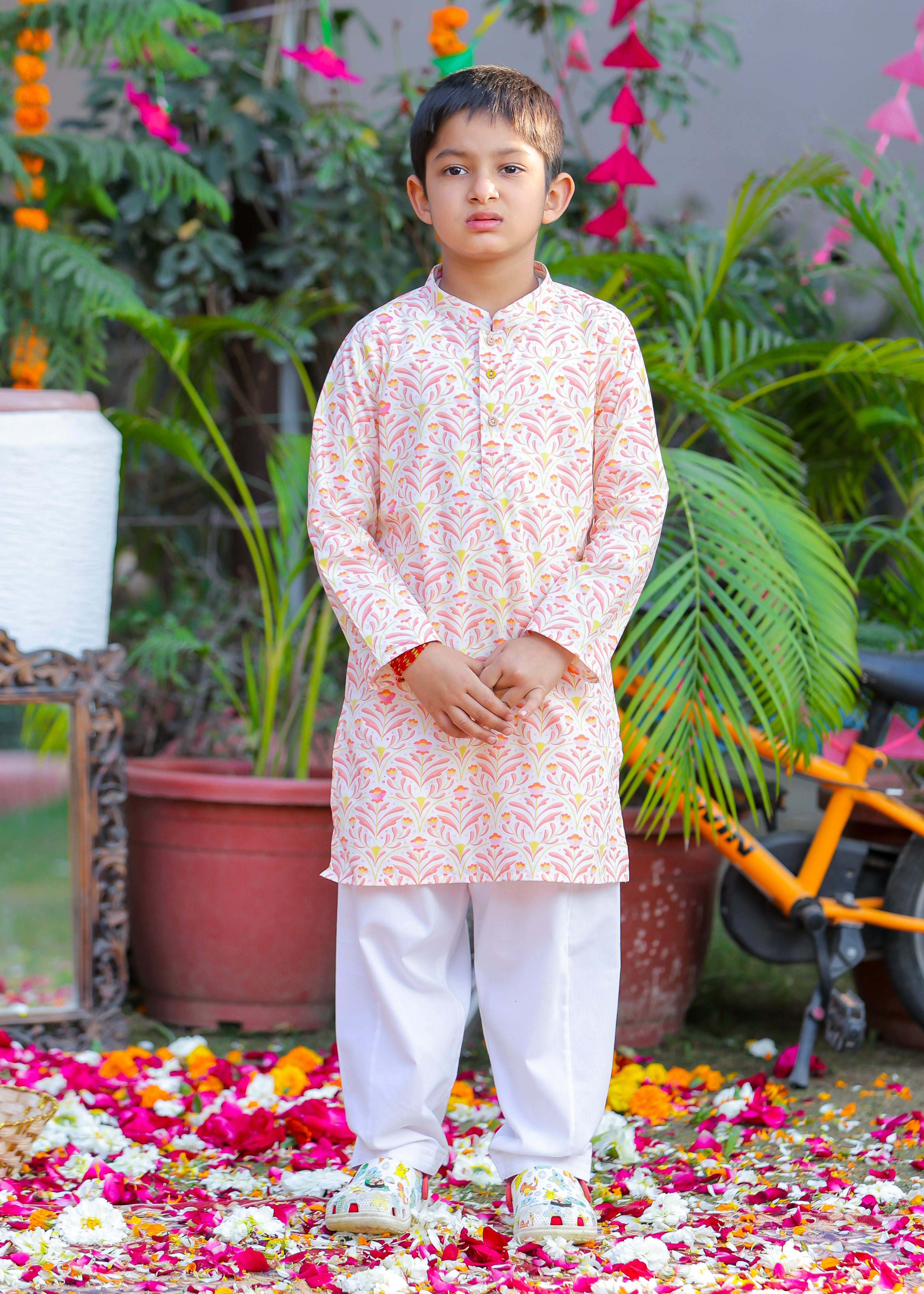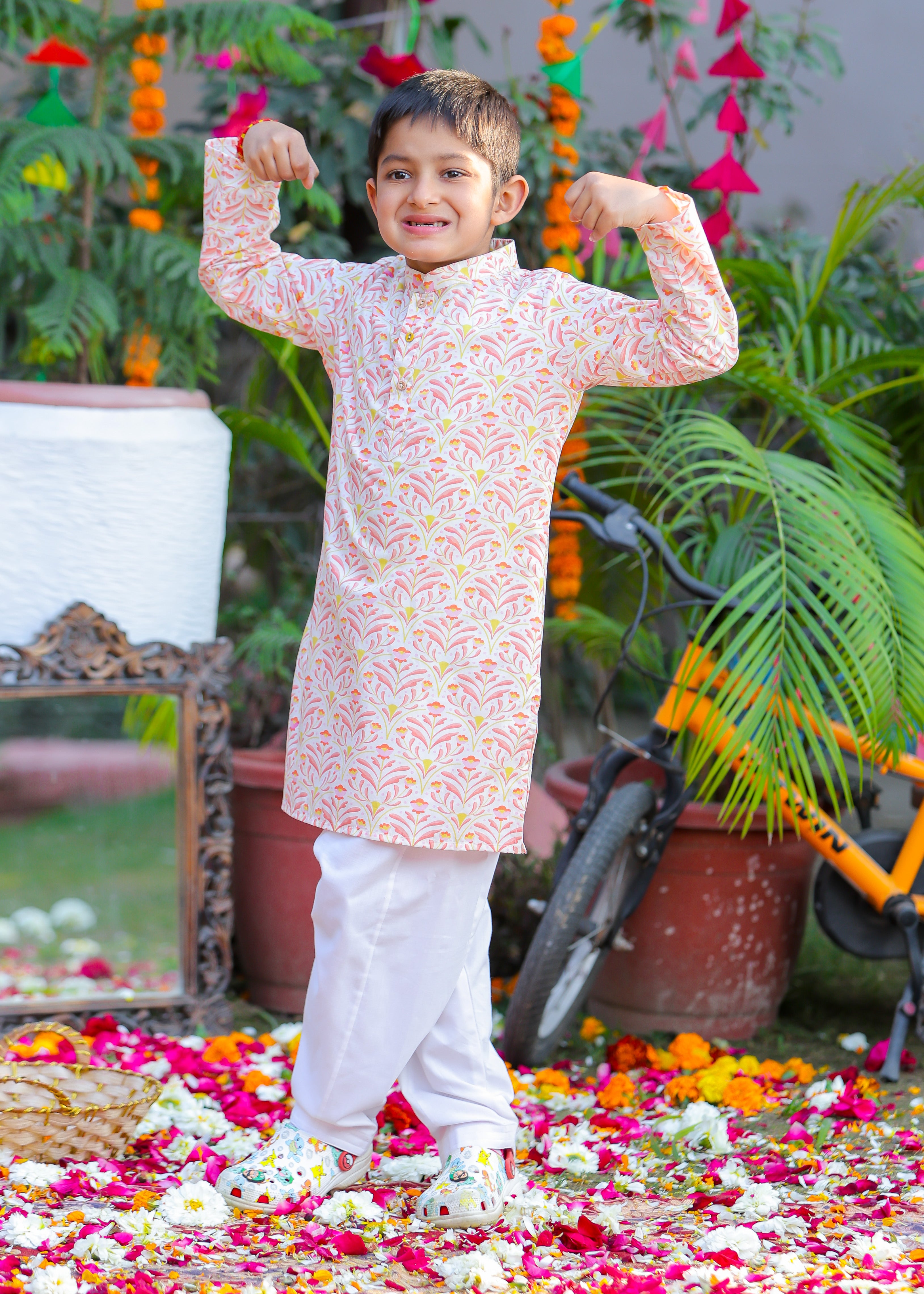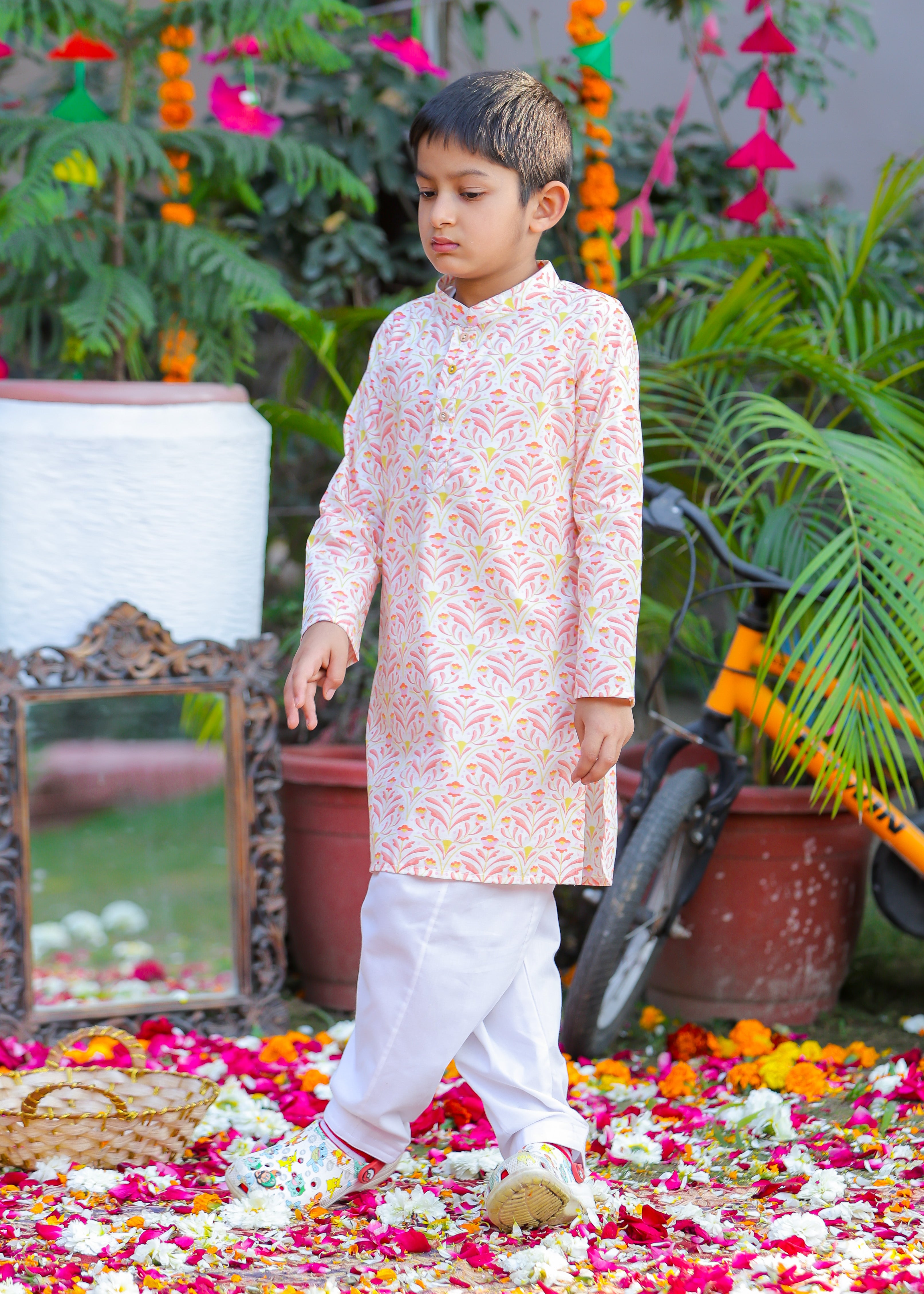Let your little prince embrace tradition with this elegant Mughal motif kurta pajama set. Designed with intricate patterns inspired by royal Mughal artistry, this outfit blends heritage with comfort. Made from soft, breathable cotton, it’s perfect for festive occasions, weddings, and cultural celebrations. Dress him in timeless charm and sophistication!