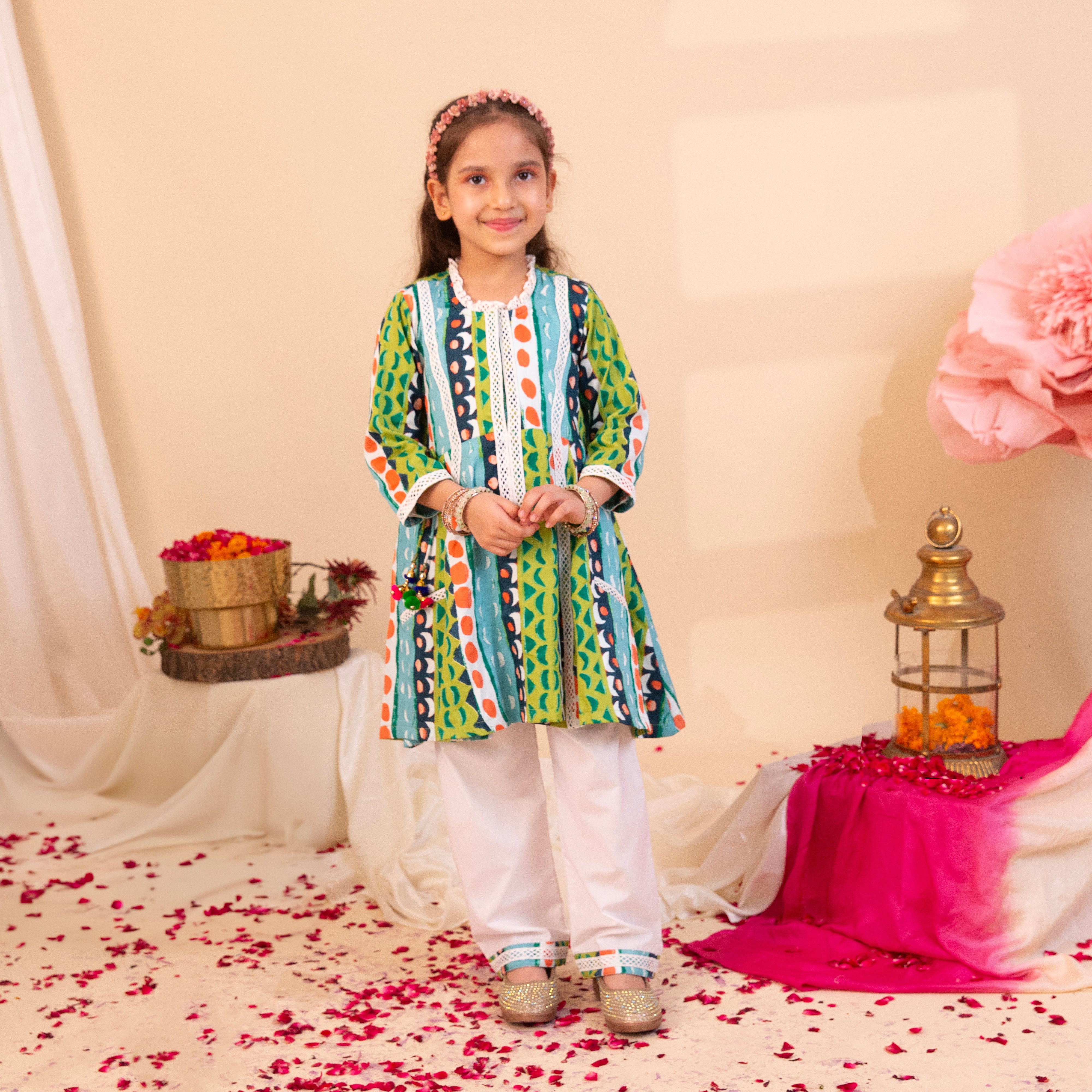 Designed with vibrant panels and delicate lace detailing, this outfit blends elegance with playful charm. The flowy, flared kurta adds a touch of grace, while the comfortable pants ensure ease of movement. Perfect for festive occasions, weddings, and celebrations, this set is a must-have for every young fashionista’s wardrobe!