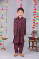 Let your little gentleman shine in this stylish blue cotton silk 3-piece jacket set! Featuring a front-open jacket, a classic kurta, and comfortable salwar, this outfit is perfect for festive celebrations and special occasions. The sleek design of the jacket adds a modern touch to the traditional ensemble, while the soft cotton silk fabric ensures comfort all day long.