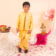 Elevate your young gentleman's ethnic wardrobe with our exquisite Boys' Printed Cotton Silk Jacket adorned with Gold Lurex Lines, paired flawlessly with a Cotton Satin Kurta Pajama ensemble. This stylish ethnic ensemble is crafted to make him stand out with sophistication and charm.