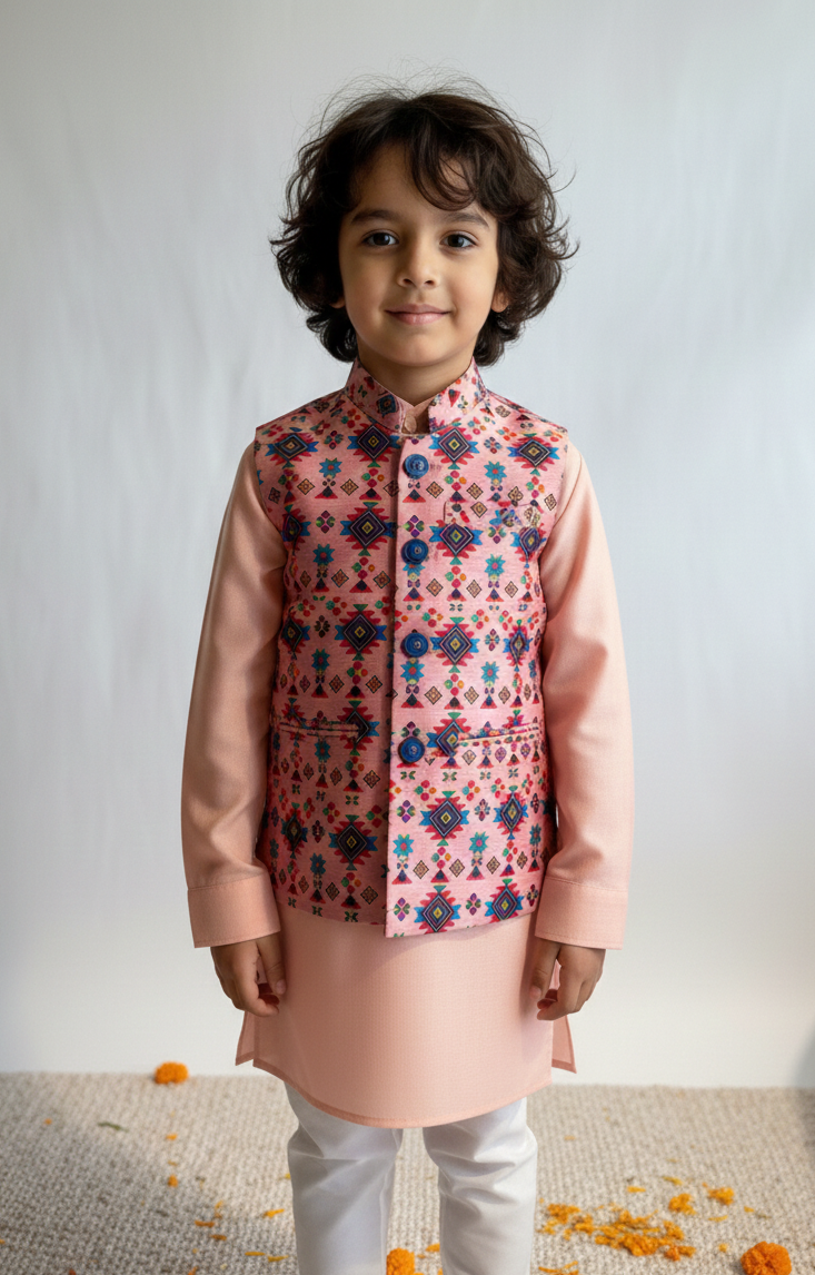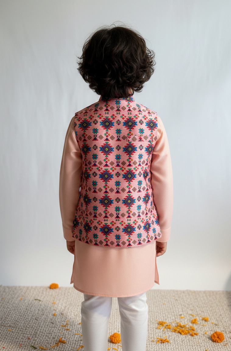 Designer Boys Silk Kurta Pajama & Printed Jacket Set