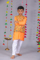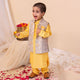 A celebration of colour and tradition, the Neel-Peet Rangmanch Jacket Set features a cheerful yellow striped kurta paired with a striking turquoise blue jacket. The kurta brings in festive flair with its leheriya-inspired print, while the jacket adds structure and sparkle with delicate threadwork, sequins, and contrast buttons. The neatly folded pocket square adds the final regal touch.