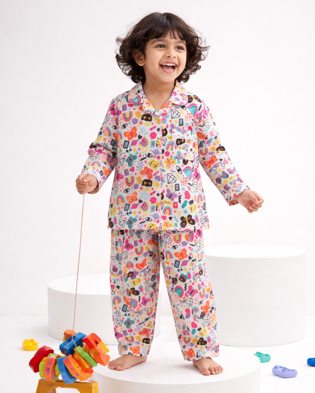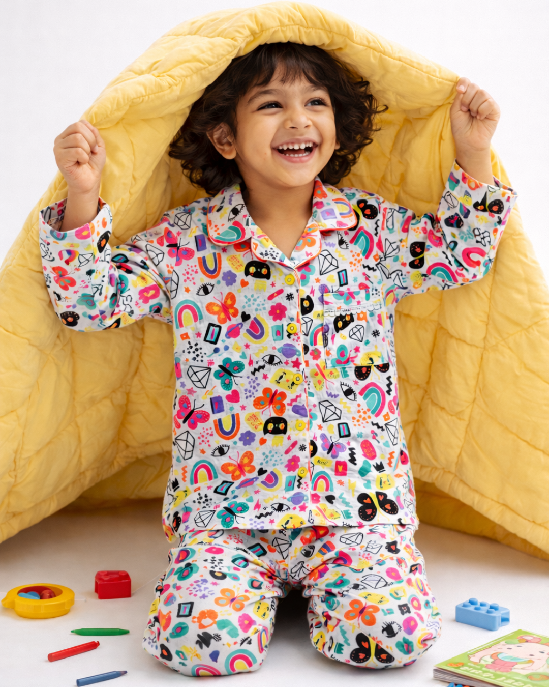 et your child's imagination run wild with our vibrant Doodle Print Cotton Nightsuit, featuring a playful mix of rainbows, butterflies, and whimsical characters. This set is crafted from 100% premium cotton, ensuring a breathable and soft feel against the skin for a restful night's sleep. The cheerful multi-color pattern and classic button-down style make it a favorite for both lounging and dreaming.