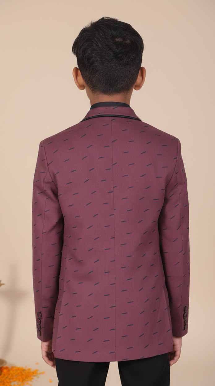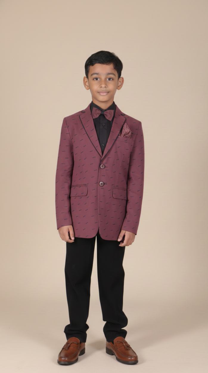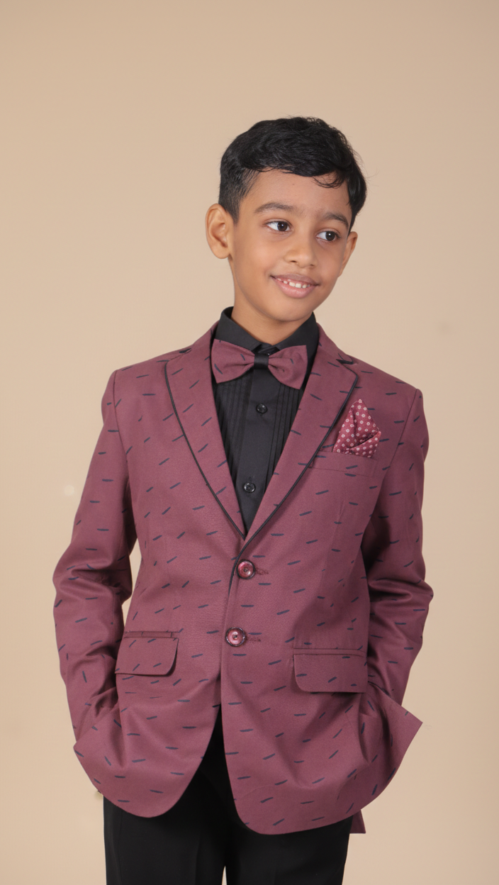 Dress your little star to impress with our 4-Piece Wine Printed Blazer Suit Set! This stylish ensemble features a statement wine-printed blazer, sleek black trousers, a coordinating black shirt, and a printed bow tie to complete the look. Perfect for weddings, birthdays, or any formal occasion, this suit combines elegance and comfort.