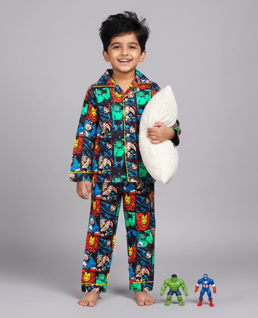Soft 100% cotton nightsuit featuring a vibrant superhero comic print. Designed with yellow piping and a notched collar for a heroic and cozy bedtime look.