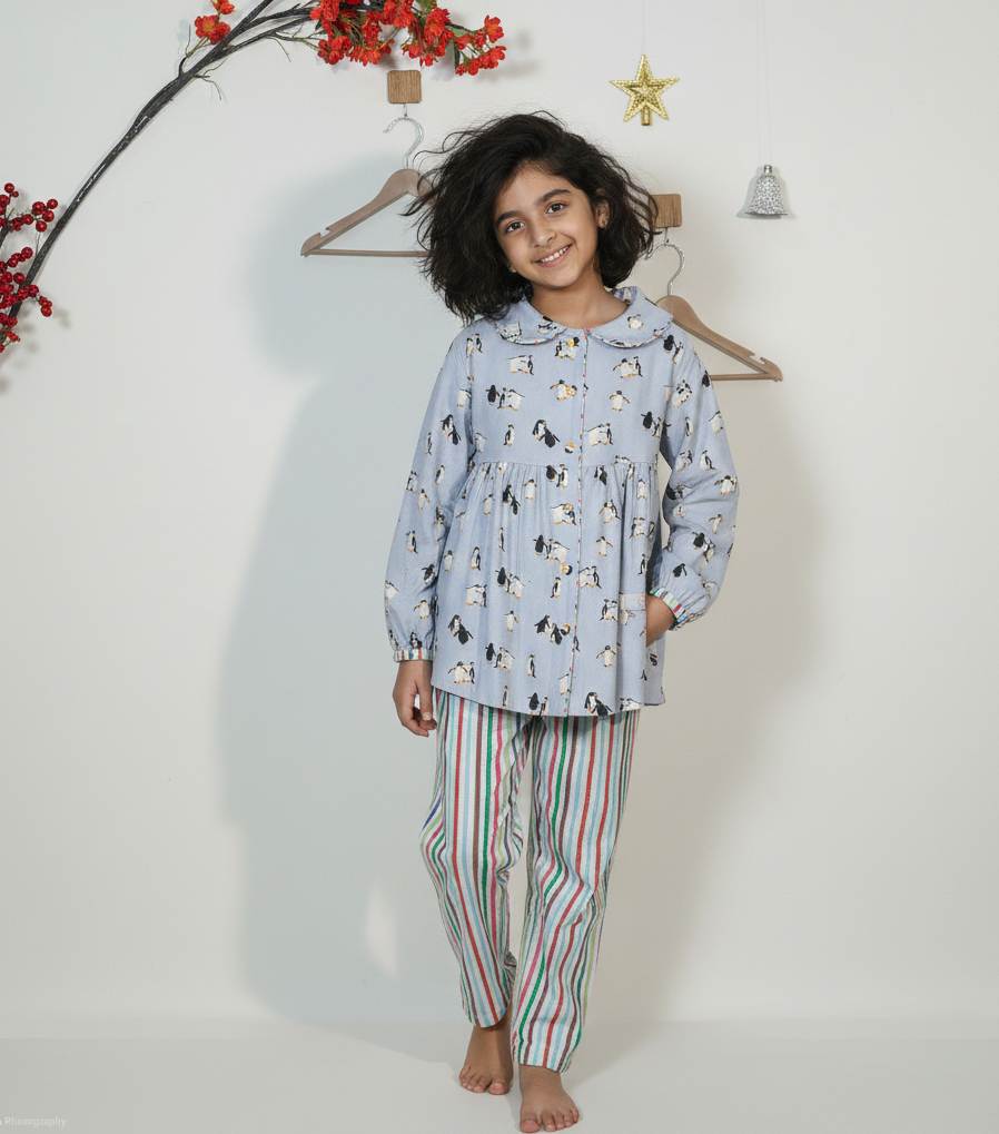 Add a touch of whimsy to bedtime with our Penguin Night Suit featuring a charming penguin-print top and cozy striped flannel pyjamas. Made from soft, breathable flannel, this set keeps your little one warm and snug all night. Perfect for bedtime stories and chilly mornings, it's a delightful blend of style, comfort, and cuteness!