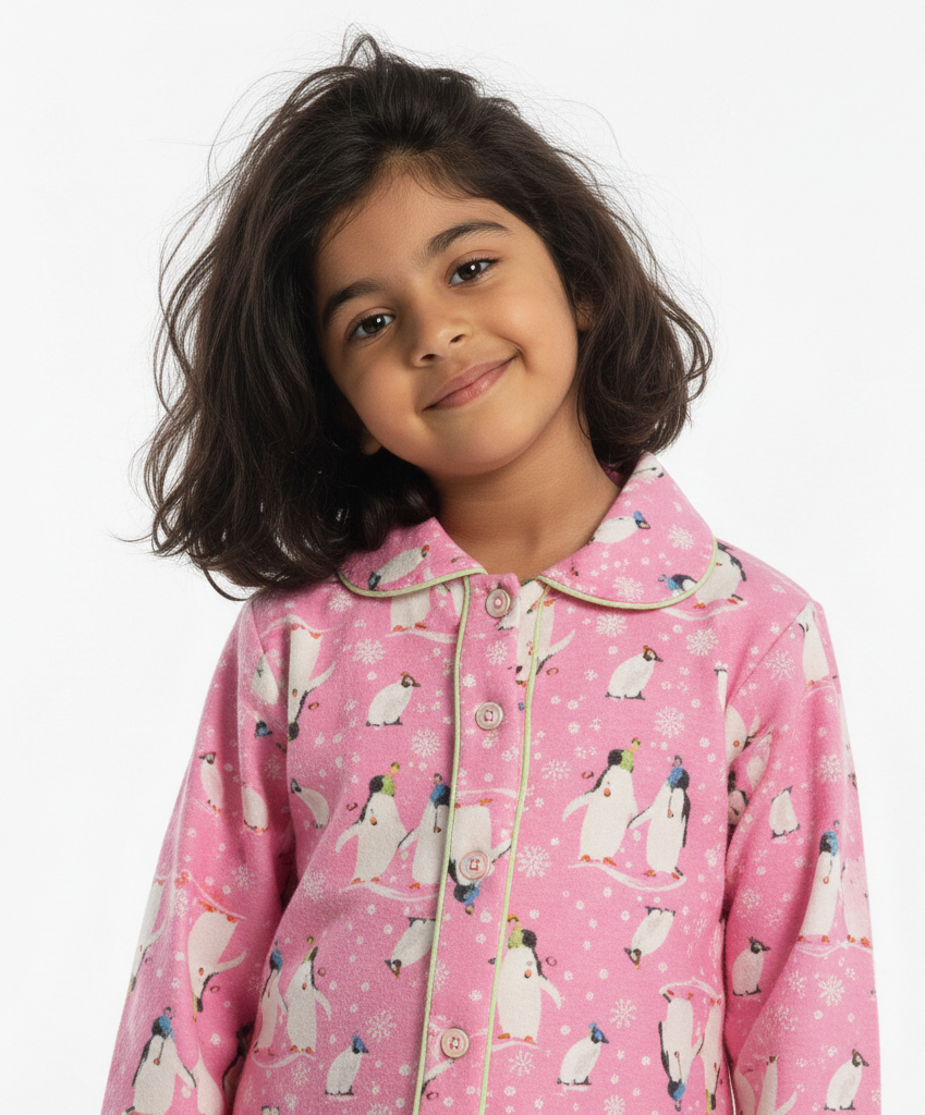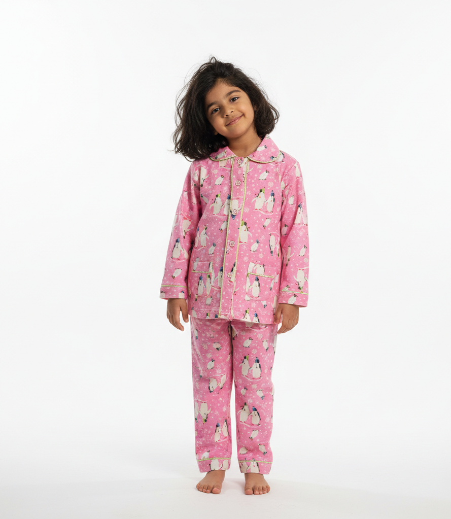 Snuggle into warmth and cuteness with our Pink Penguin Flannel PJ Set for kids! Featuring adorable penguin prints on ultra-soft, premium flannel fabric, this set is perfect for chilly nights and playful mornings. Designed for comfort and fun, it comes with a snug-fit elastic waistband and easy-to-wear button-up top. Let your little ones dream in style!