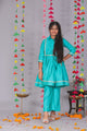 A celebration of colour and tradition, the Neel-Peet Rangmanch Jacket Set features a cheerful yellow striped kurta paired with a striking turquoise blue jacket. The kurta brings in festive flair with its leheriya-inspired print, while the jacket adds structure and sparkle with delicate threadwork, sequins, and contrast buttons. The neatly folded pocket square adds the final regal touch.