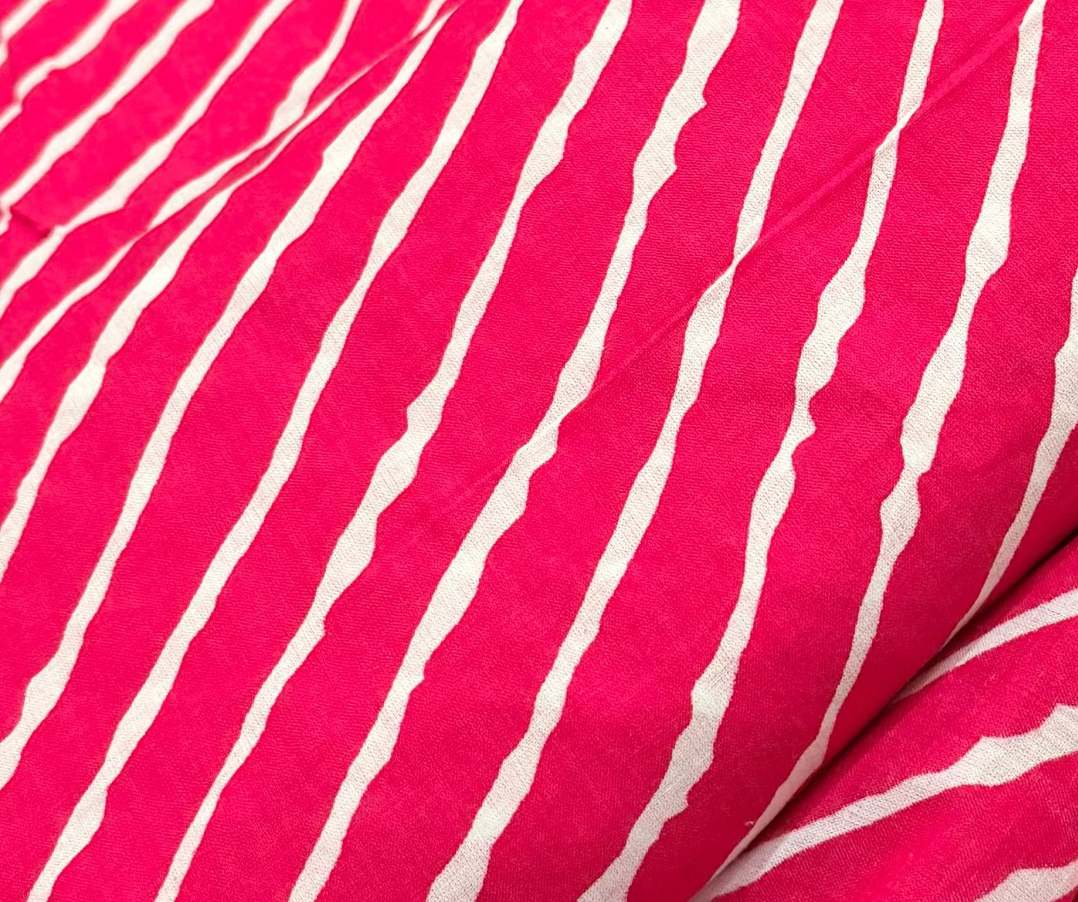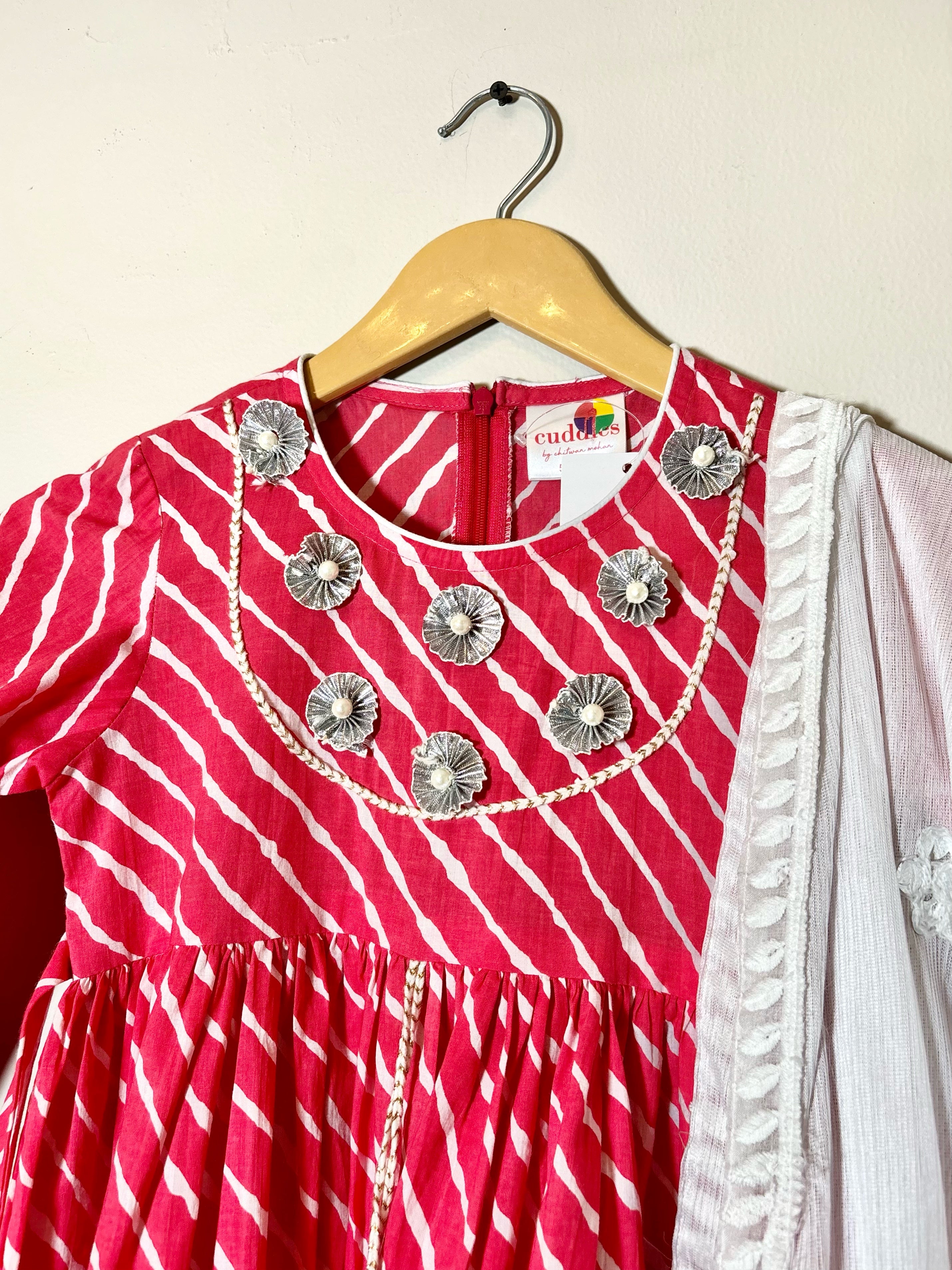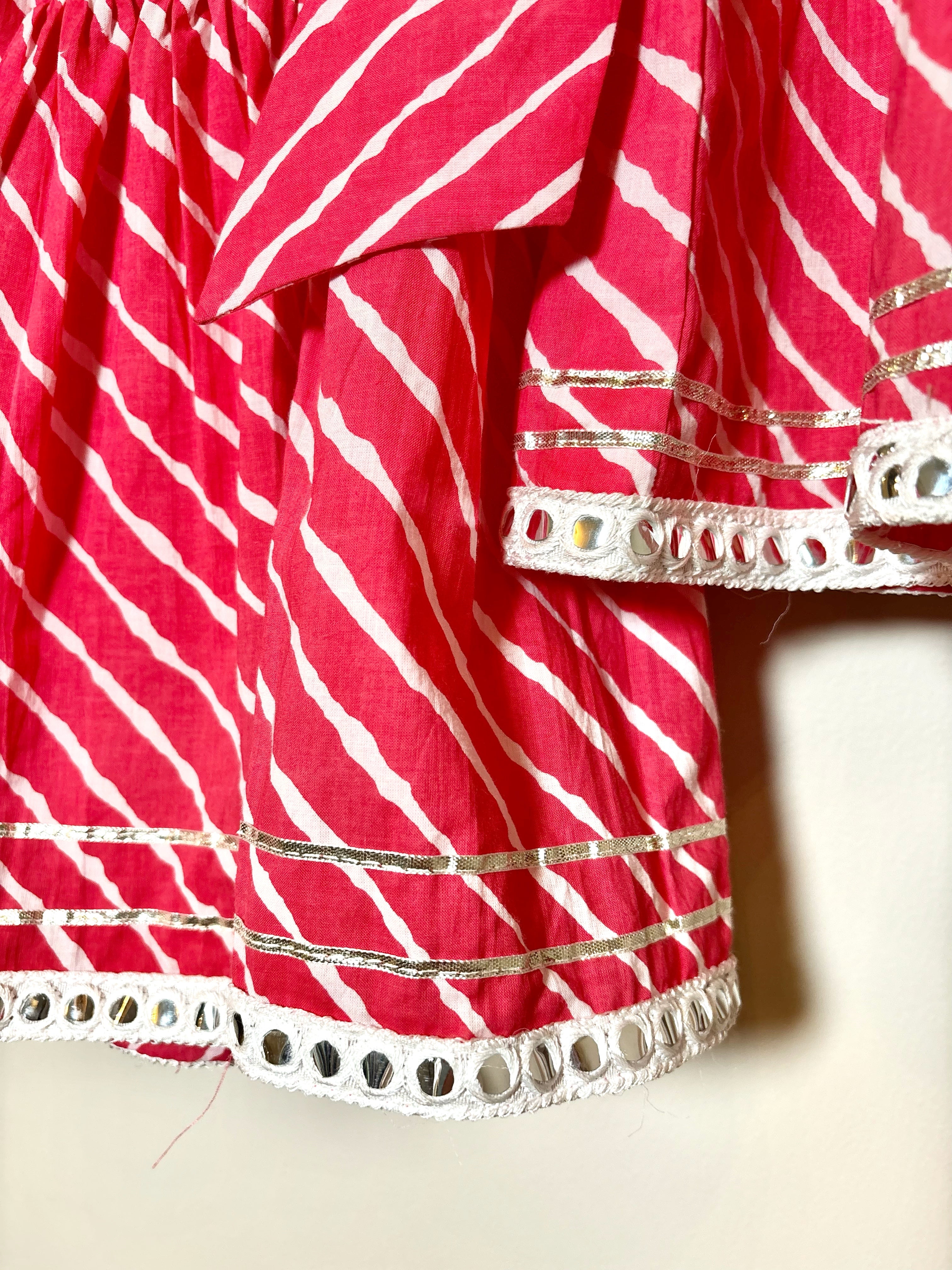 This striking Rani Pink ensemble features the classic Rajasthani Leheriya (diagonal stripe) pattern. The short peplum-style kurta is beautifully detailed with mirror-work accents and silver lace borders, paired with matching flared sharara pants for a graceful festive silhouette.