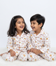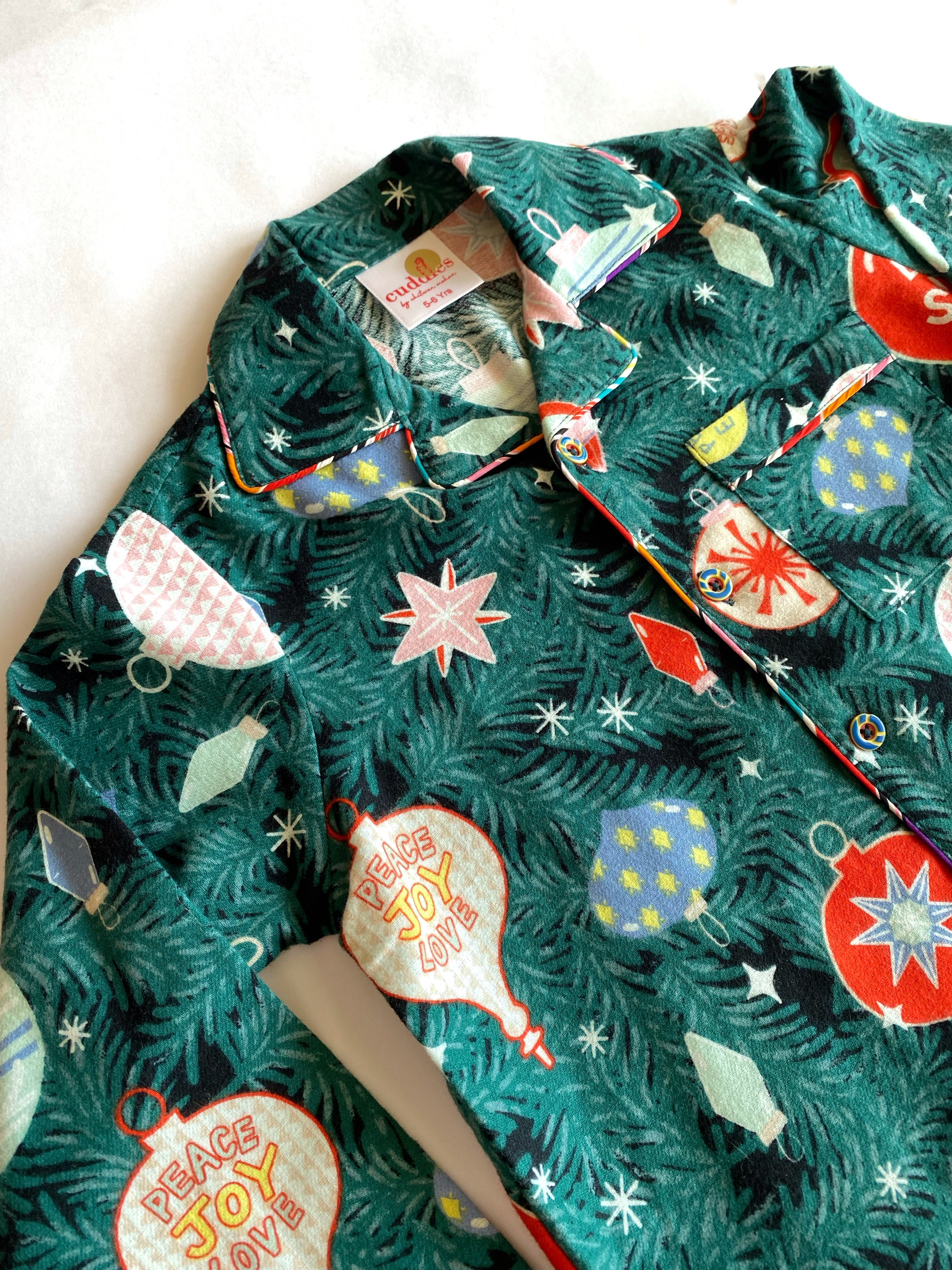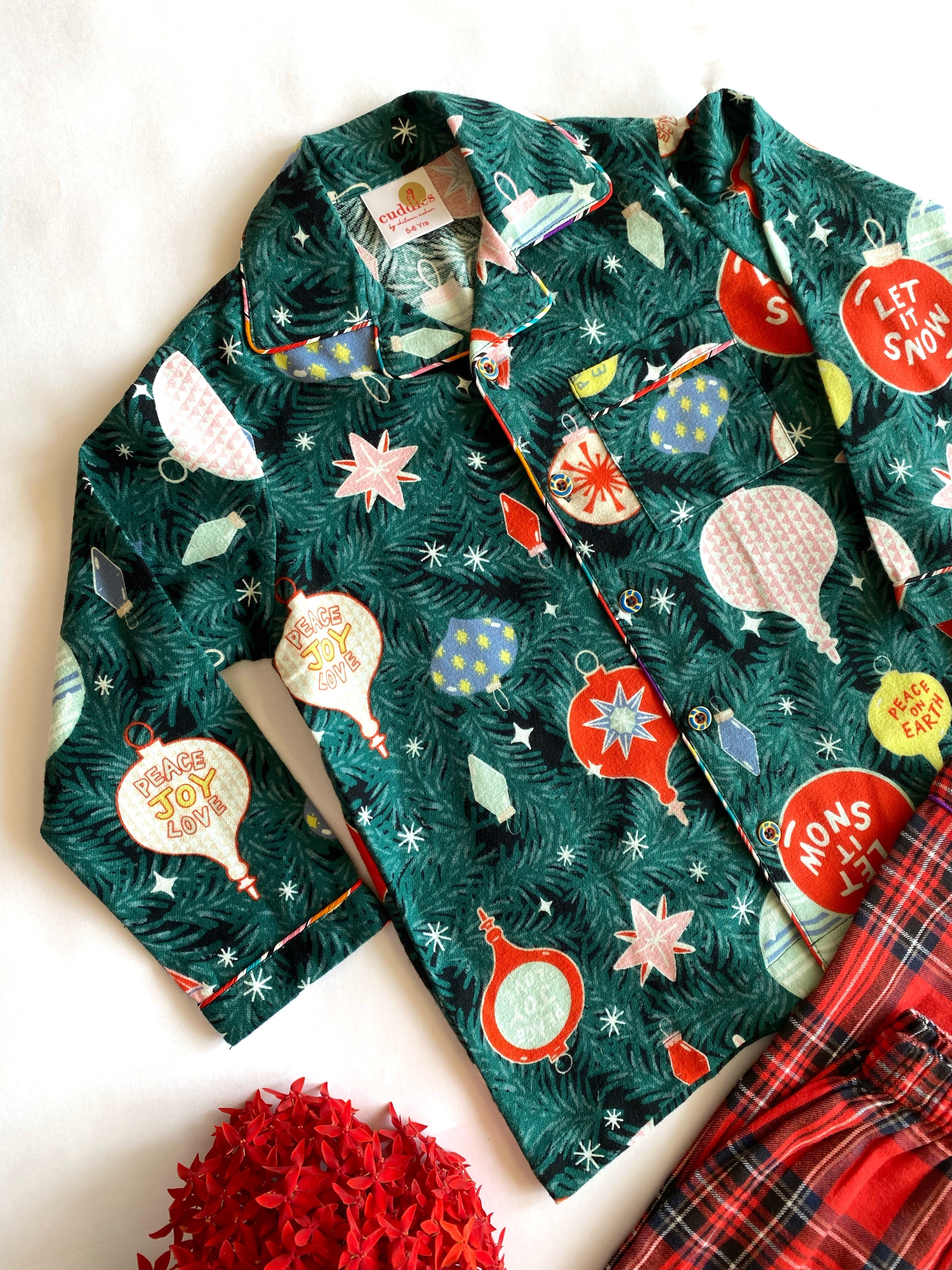 Bring the magic of the holiday season to bedtime with our Christmas Ornament Flannel Nightsuit. Crafted from premium cotton flannel, this set features a rich green pine branch pattern adorned with vibrant holiday ornaments and festive messages like "Peace, Joy, Love." The soft, brushed fabric and classic notched collar ensure your little one stays warm and stylish all winter long.