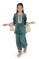 A festive delight in mul chanderi, this pink kurta set is adorned with golden butis, tassel detailing, and a contrasting green sharara. Paired with a soft dupatta and a cute potli, it’s a perfect blend of comfort and charm for little stars to shine bright this season.