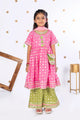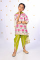 Crafted in soft mul cotton, this mustard kurta is highlighted with colorful embroidered motifs and playful gota trims. Paired with vibrant pink pants and a green dupatta, it’s a cheerful festive outfit that blends tradition with comfort for your little one’s celebrations.