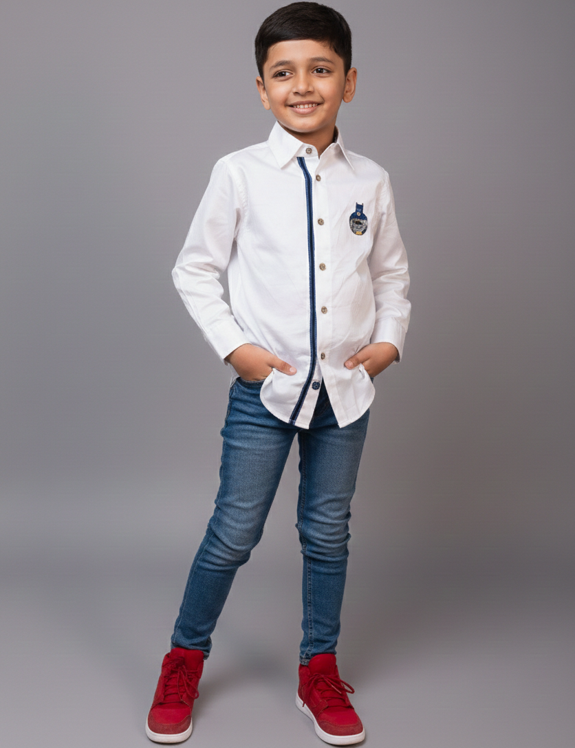 Let your little one channel their inner superhero with this stylish Batman Embroidered Shirt. Featuring a sleek, detailed Batman emblem, this shirt is perfect for fans of the iconic Dark Knight. Crafted from soft, durable fabric, it's designed for comfort while adding a touch of superhero flair to any outfit. Whether for casual outings or special events, this shirt will make your boy feel like Gotham’s finest!