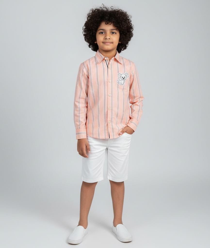 Boys Peach Striped Cotton Shirt with Dog Patch