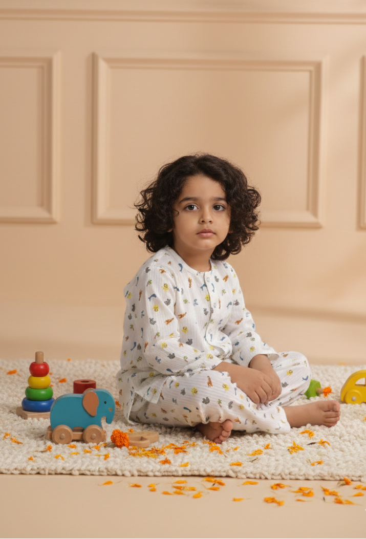 Kids White Muslin Nightsuit with Safari Animal Print