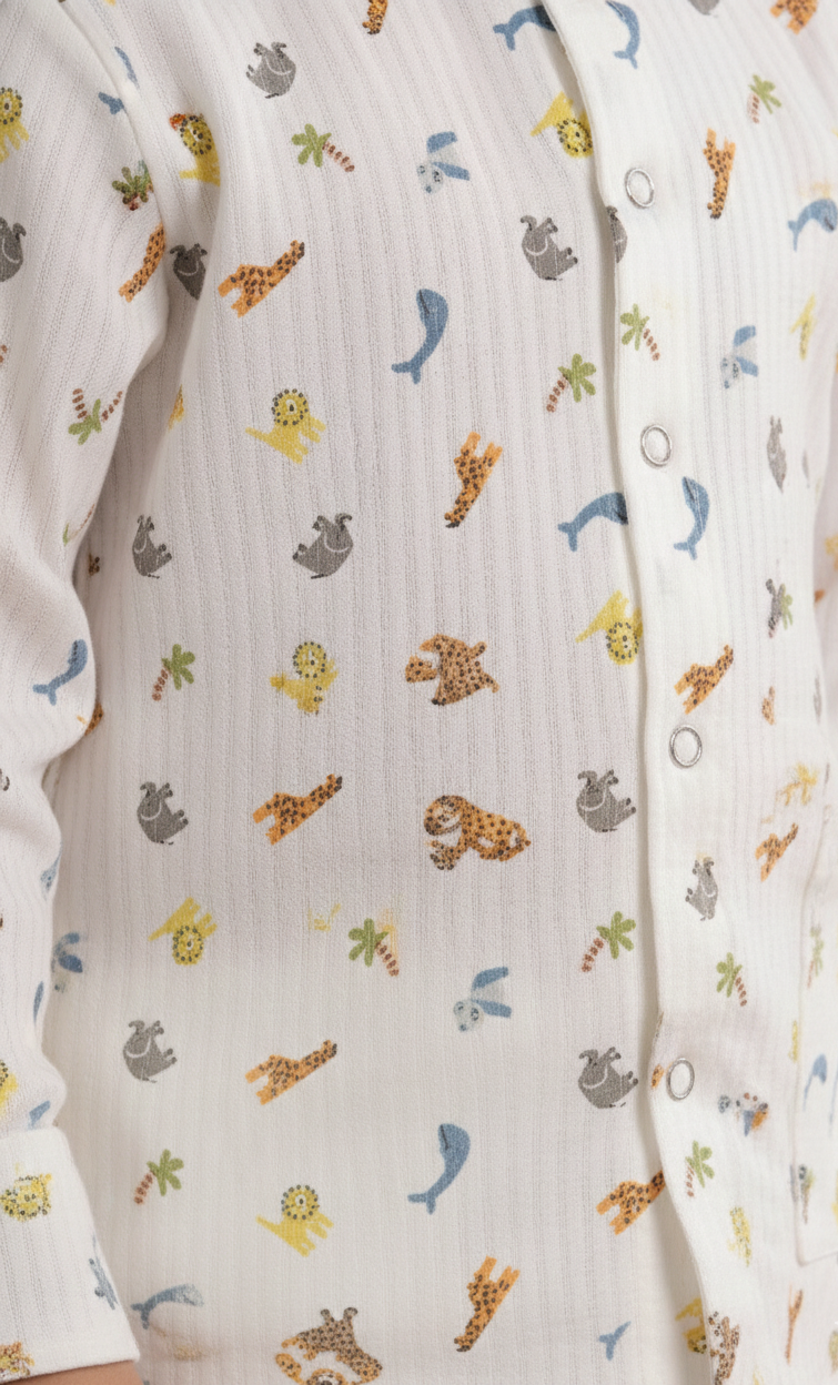 Introduce your baby to the world of comfort and charm with our animal print muslin nightsuit. Crafted from ultra-soft, breathable muslin fabric, this nightsuit keeps your little one cozy and snug all night long. The delightful animal print adds a playful touch, making it a favorite for both parents and babies. Featuring snap-button closures for easy dressing and diaper changes, this outfit combines style and practicality. Perfect for delicate skin, it's a must-have for your baby’s bedtime wardrobe.