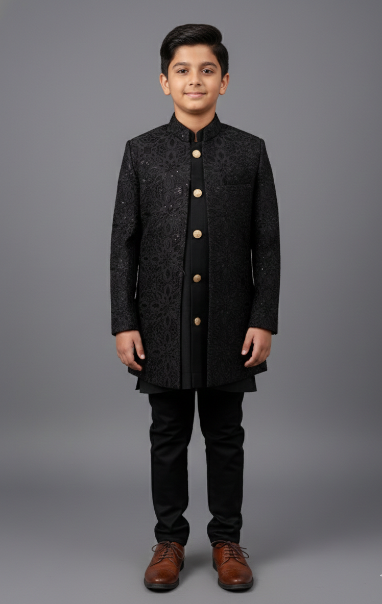 The front-open style provides a contemporary twist to the traditional Indo-Western look, ensuring your child stays comfortable while looking sharp. Crafted from high-quality fabric that retains its shape and texture, this set is a timeless addition to any ethnic wardrobe.