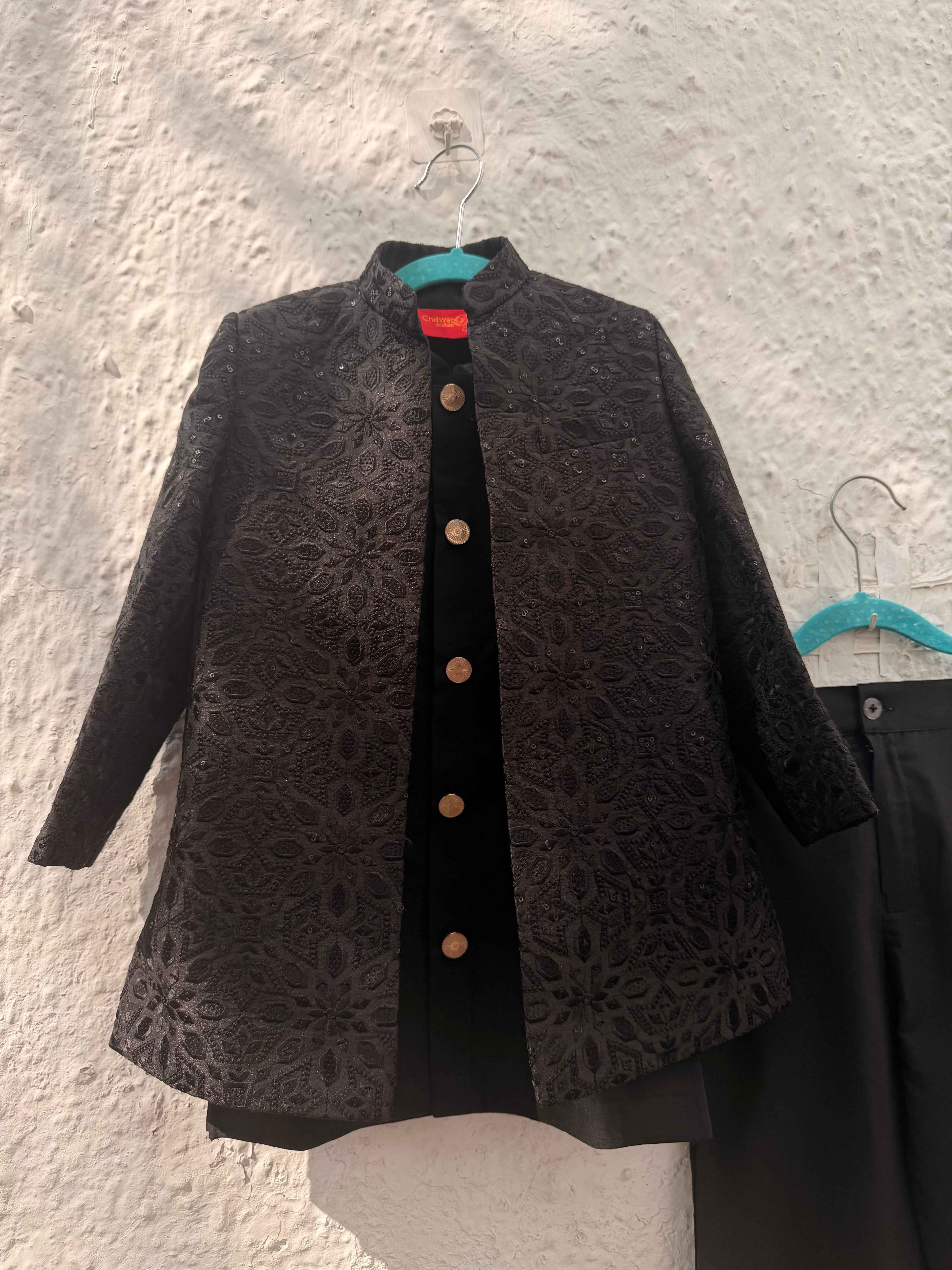 Components: A complete 3-piece set including the jacket, inner kurta, and matching trousers.