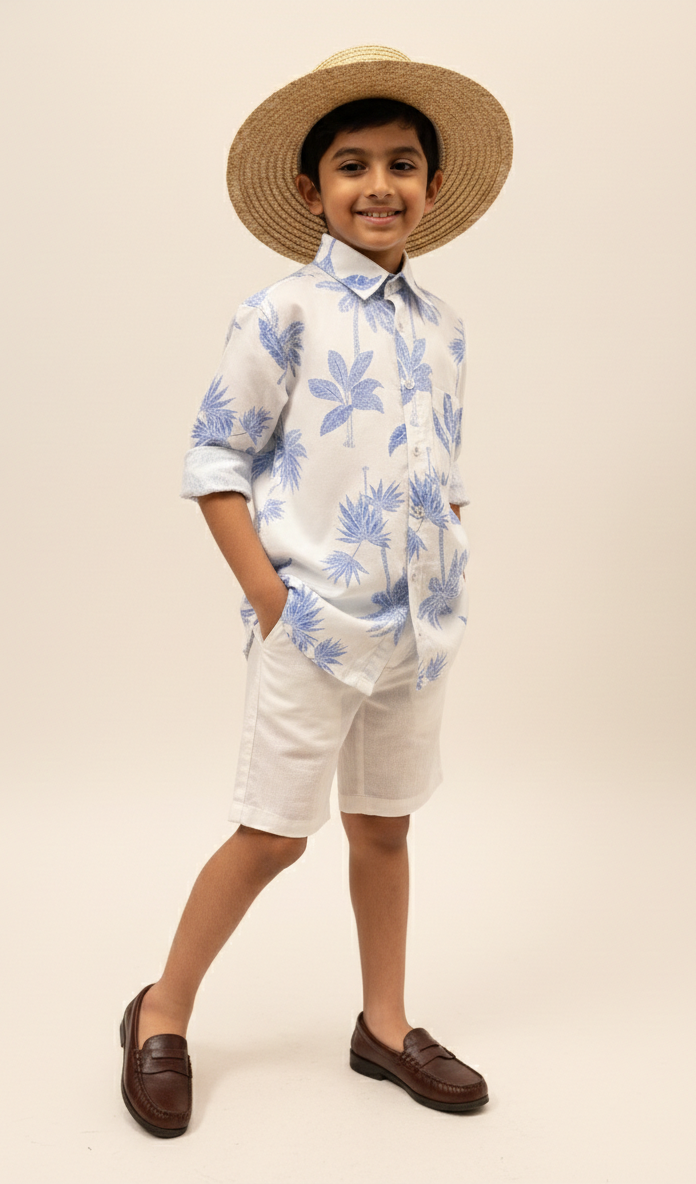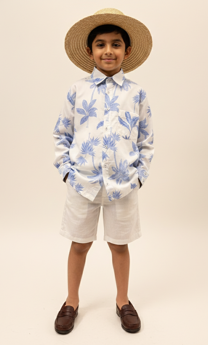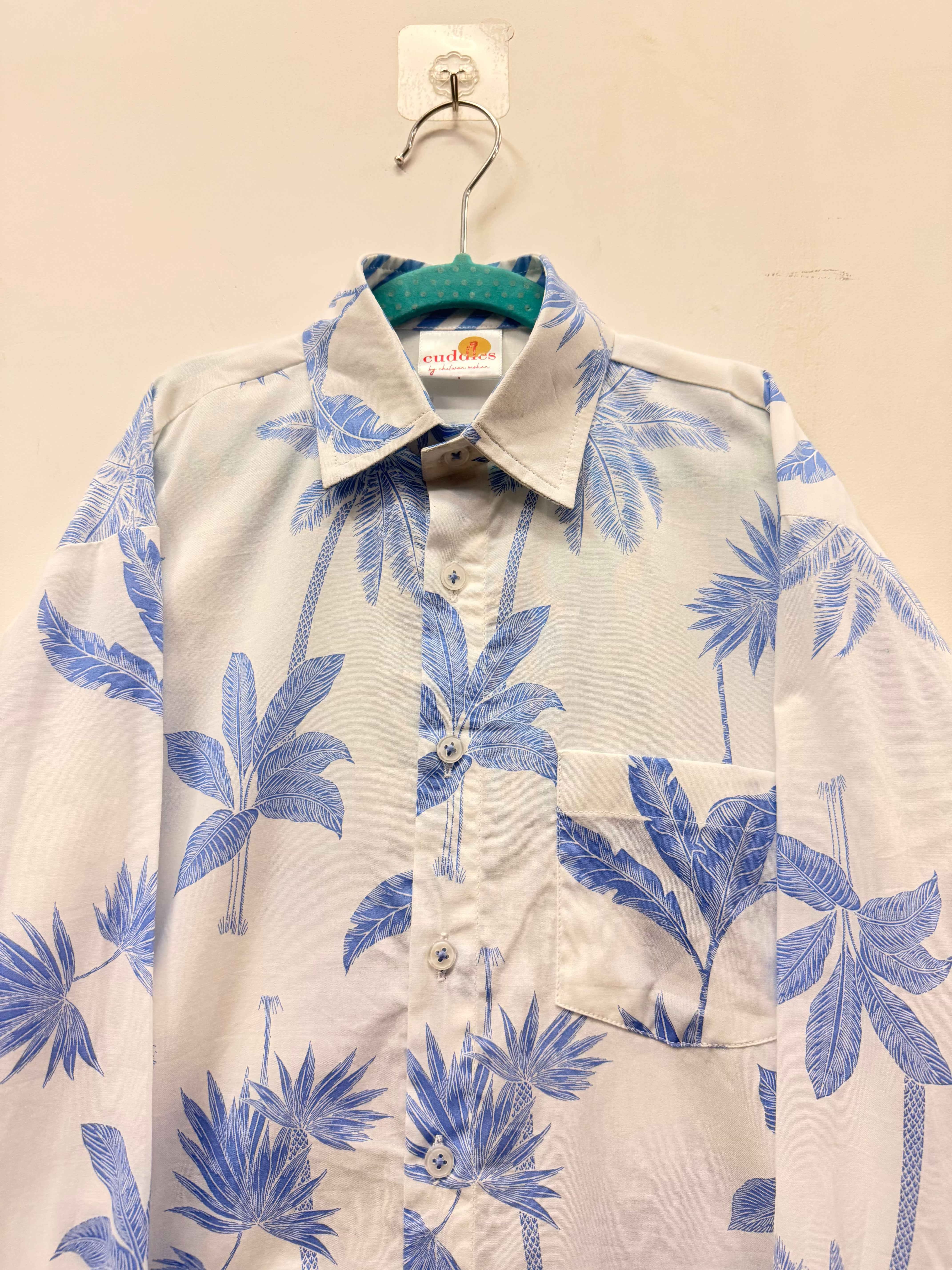 Boys' Blue Palm Tree Print Cotton Shirt