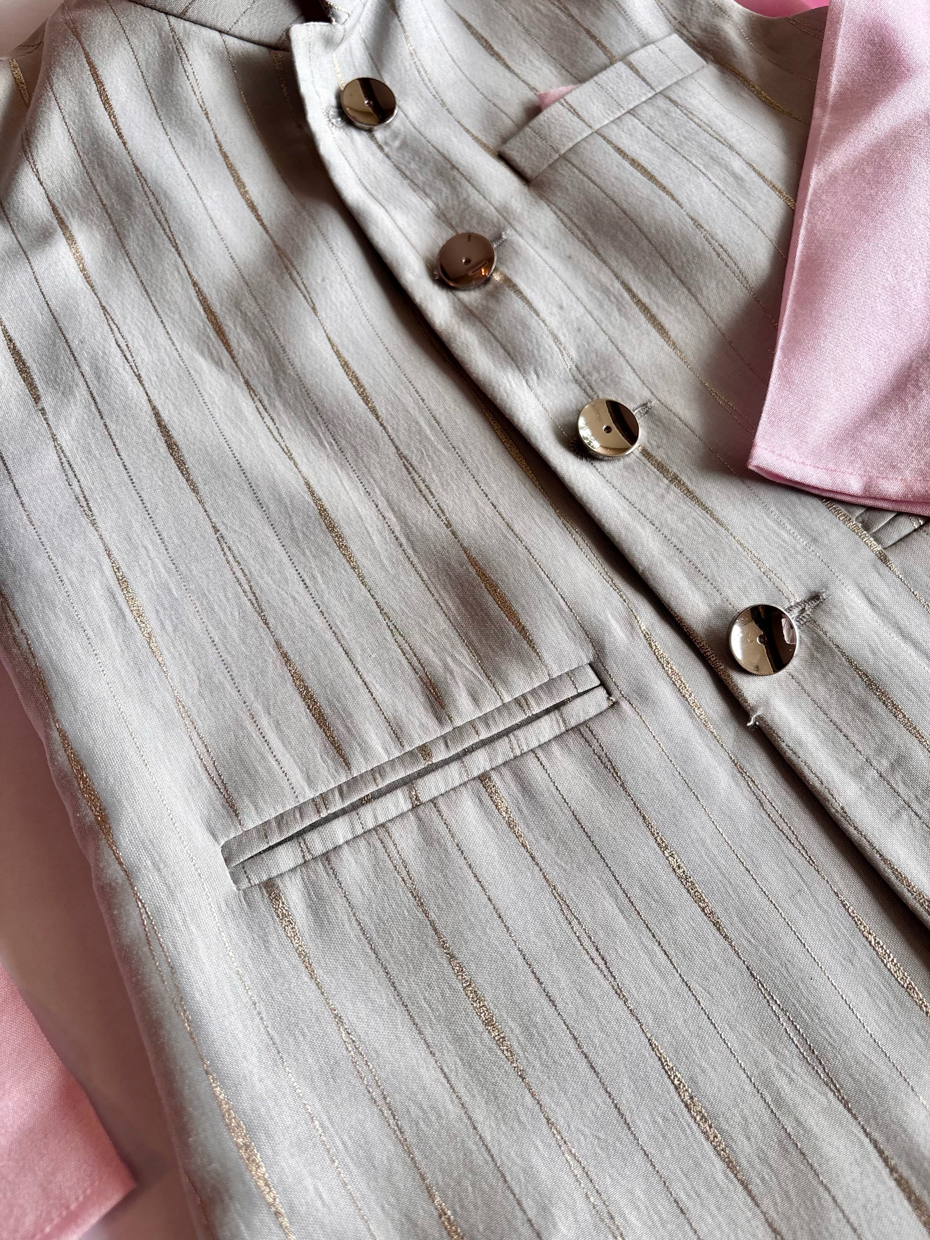 • Design: Grey Nehru jacket with metallic gold pinstripe detailing.