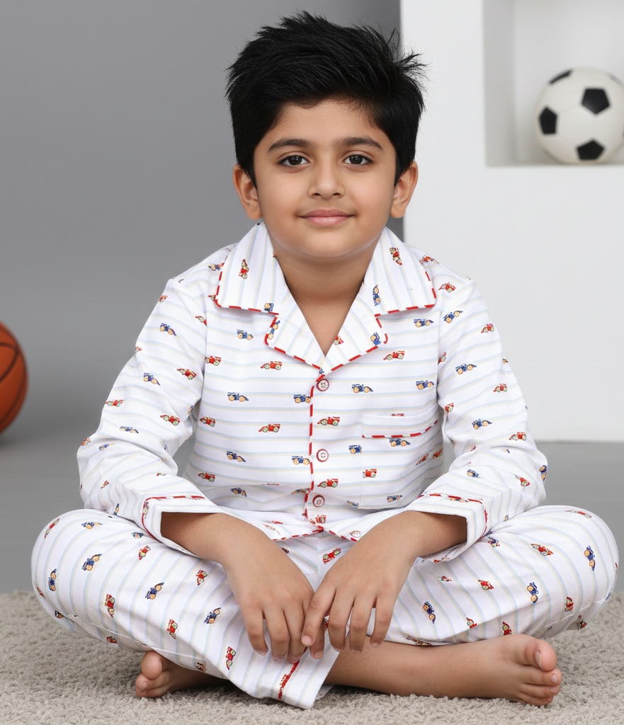 Get your little speedster ready for the coziest race of the night! Our Race to Dreamland Night Suit is designed for kids who love the thrill of race cars and the comfort of soft, breathable sleepwear. Featuring vibrant Formula race car prints, this night suit turns bedtime into an adventure on the fast track to dreamland.