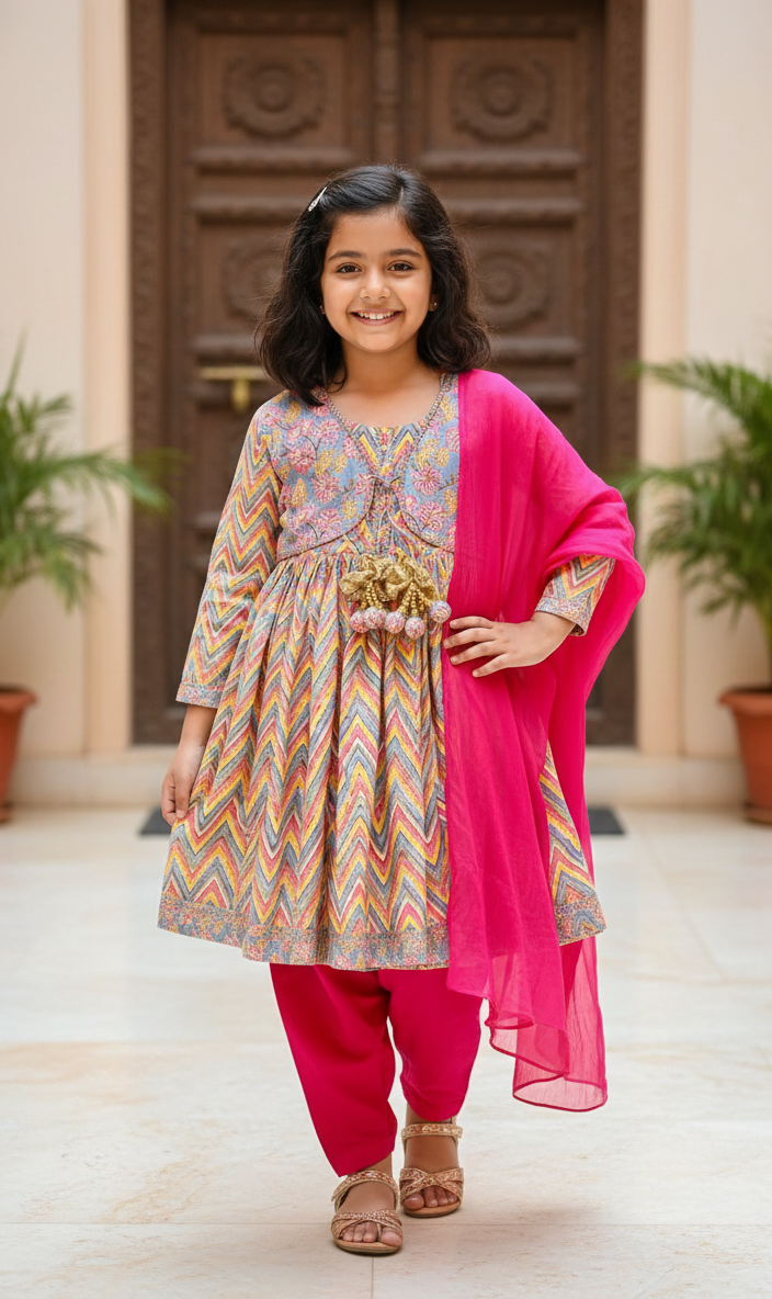 Elevate her ethnic wardrobe with our vibrant Girls' Zig-Zag Print Anarkali Kurta Set. This 3-piece Indian ethnic ensemble combines traditional silhouettes with a modern geometric twist, making it a perfect choice for festivals, weddings, and family gatherings.