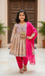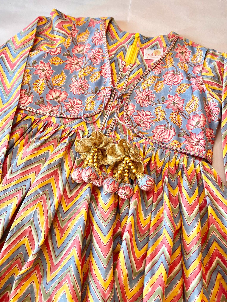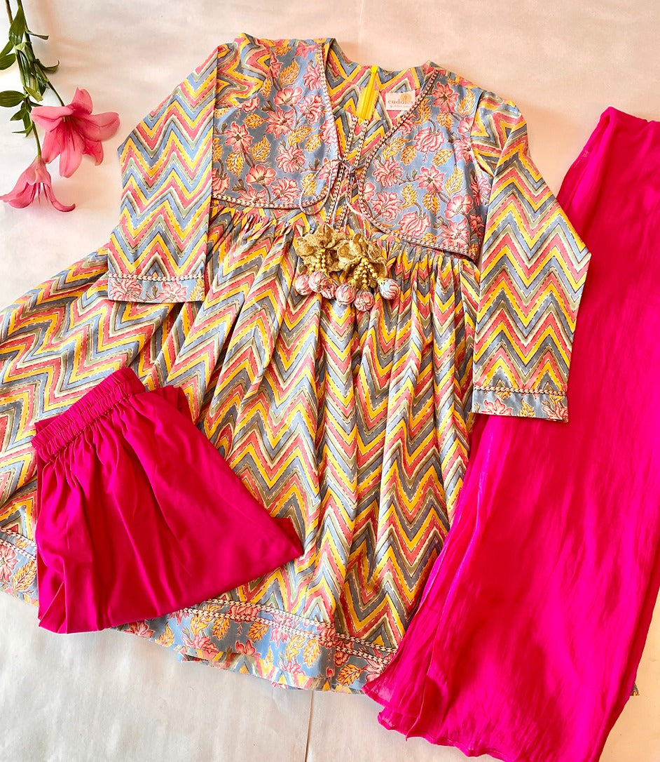The Anarkali-style kurta features a premium multi-color zig-zag and floral print, accented by a detailed yoke and heavy golden tassels (latkans) that add a playful festive touch. Paired with soft, tapered pink trousers and a matching breathable dupatta, this set offers all-day comfort without compromising on style.