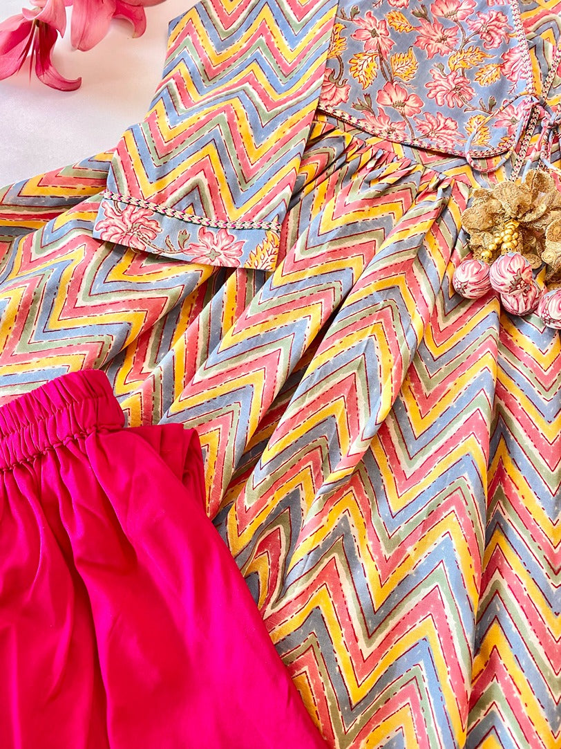 Girls Cotton Zig-Zag Print Anarkali Kurta Set with Dupatta