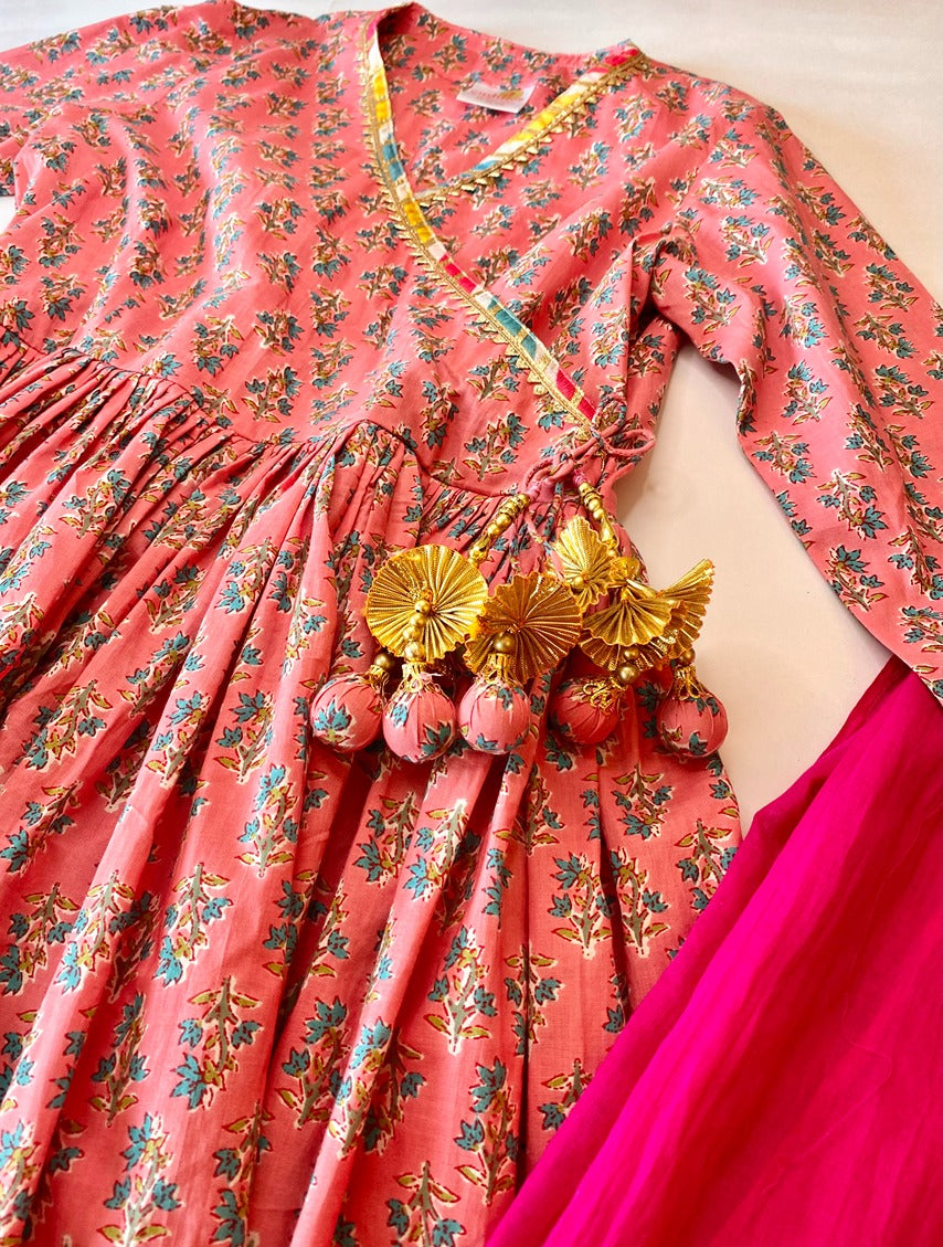 Crafted from soft, breathable cotton, this set ensures your child stays cool and comfortable, even during longer events. The charming Angrakha style, adorned with delicate tassels and a vibrant floral print, captures a timeless aesthetic. Paired with soft pajamas and a matching dupatta, this outfit is ready for memorable moments, from weddings and festive celebrations to cultural events and parties.