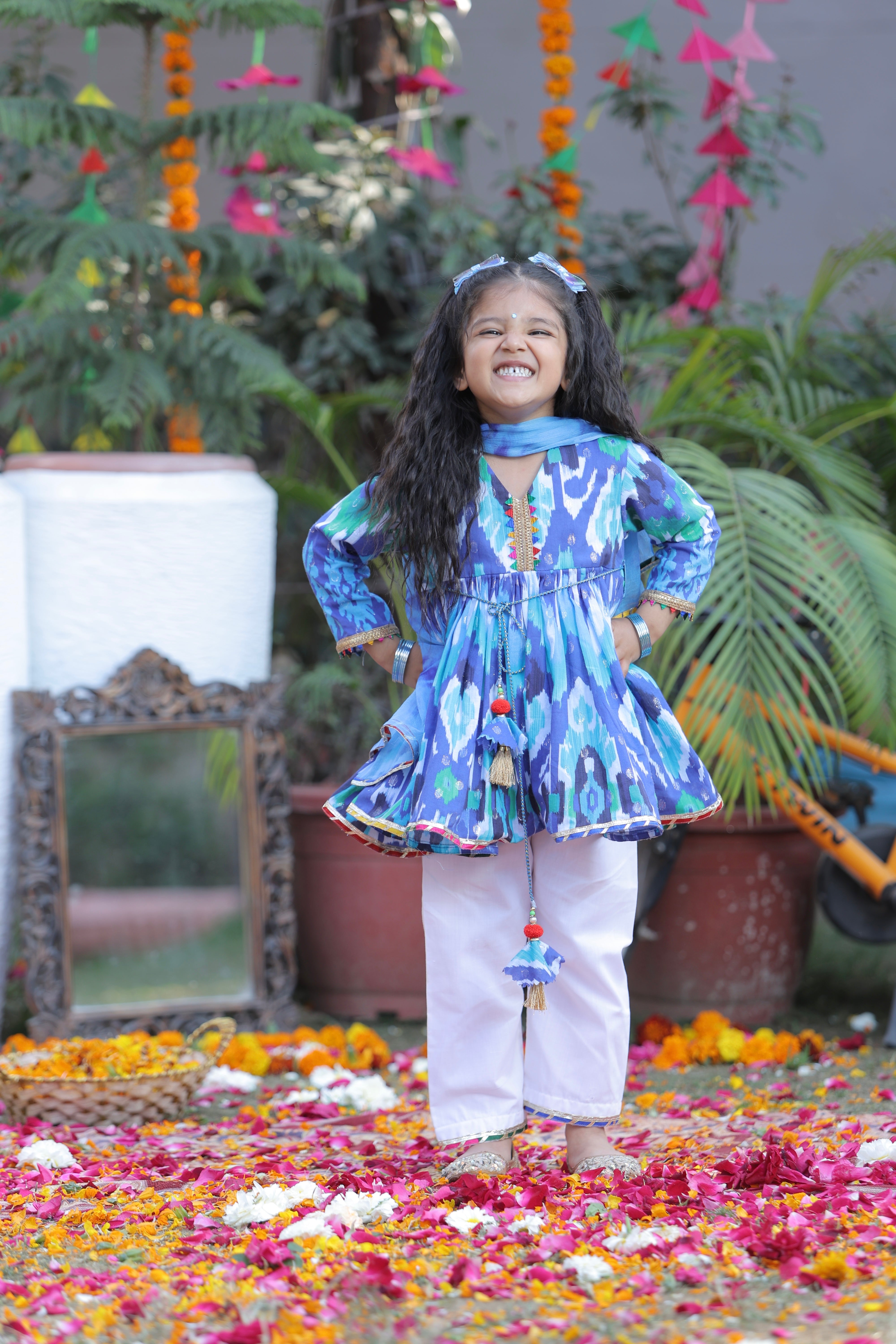 Celebrate festivities in style with our vibrant Ikkat print kurta and comfy cotton pants, paired with a dreamy tie-dye chiffon dupatta! This cheerful outfit is perfect for little ones who love to play and twirl in colors. Soft, breathable, and festival-ready—let the fun begin! 🌈✨