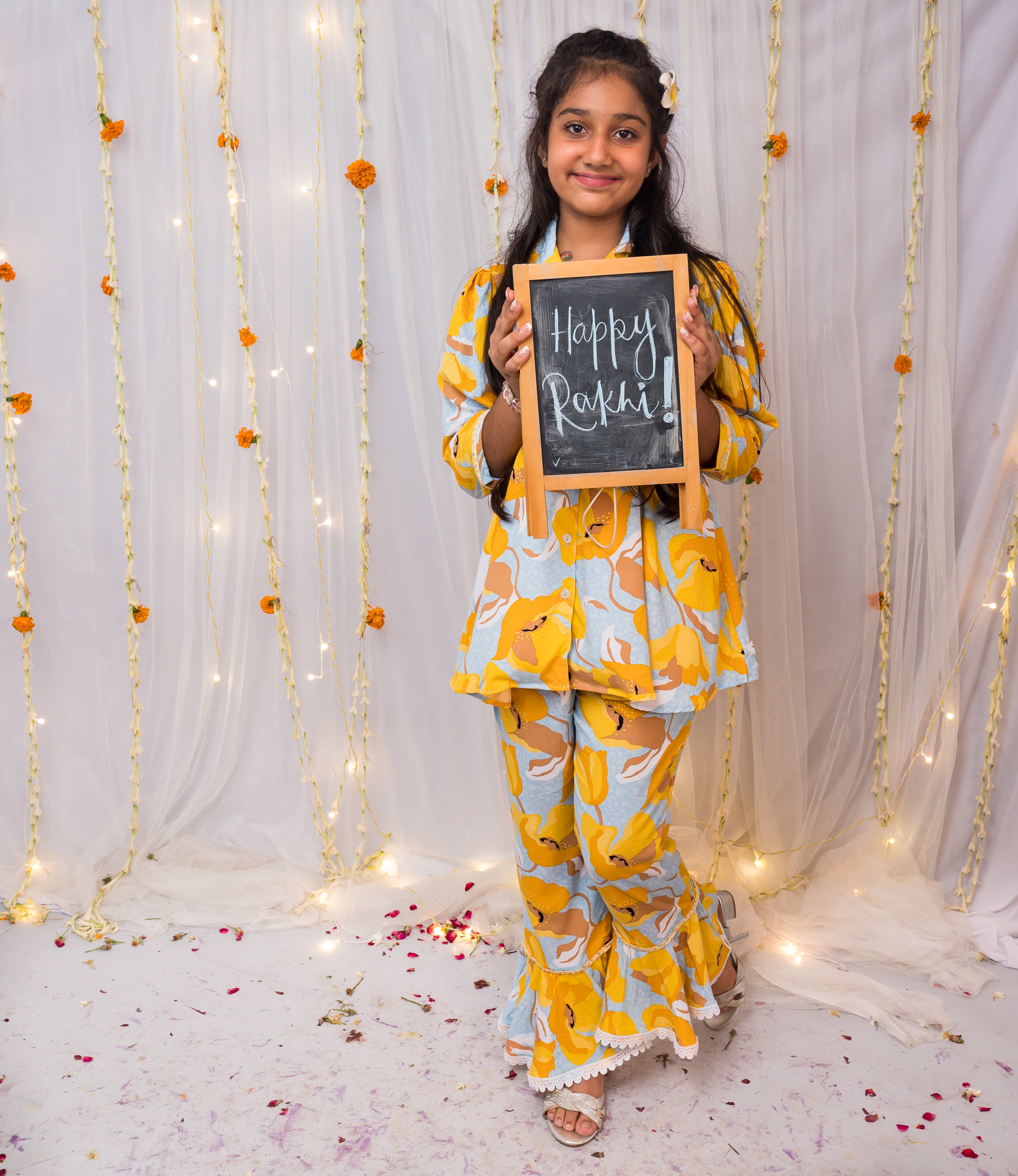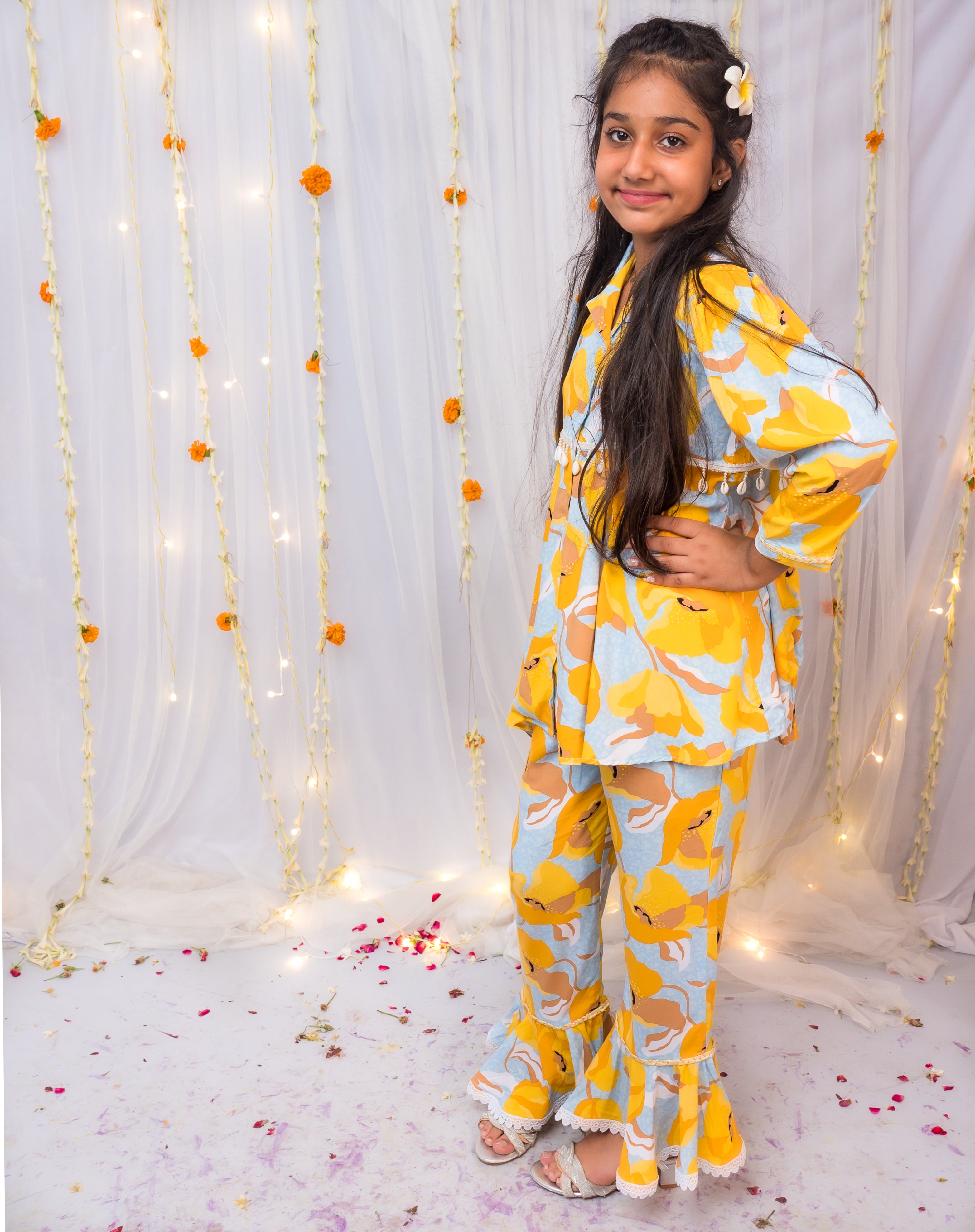 Elevate your little girl's style with this Yellow Floral Print Co-ord Set for Girls, perfect for any occasion. The top features a delicate shell lace detailing at the waist, adding a touch of elegance to the vibrant floral design. Paired with bell-bottom style flared pants, this outfit ensures comfort and flair. Whether it's a day out or a special event, this ensemble combines playful charm with chic sophistication, making it a must-have in her wardrobe.