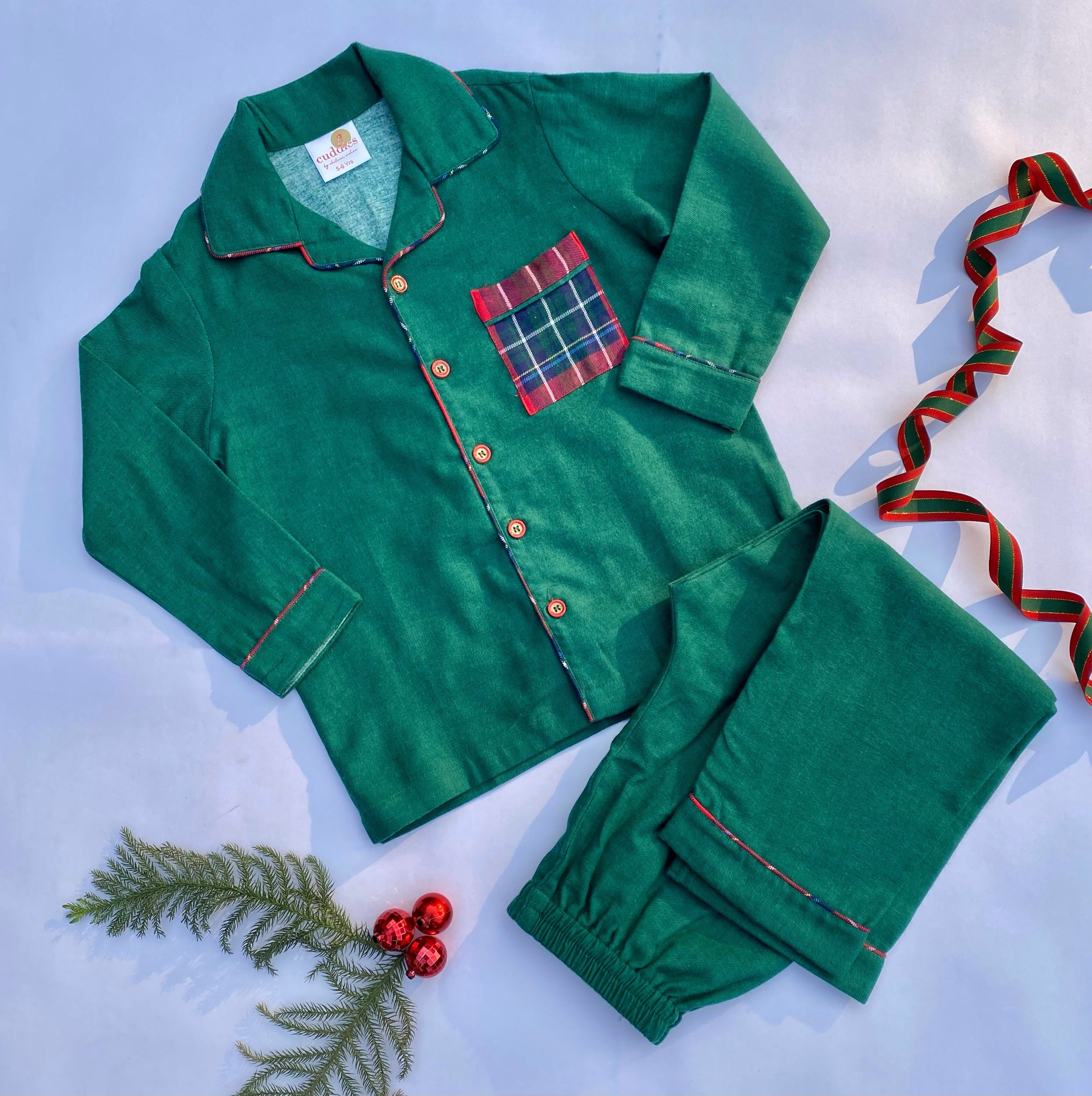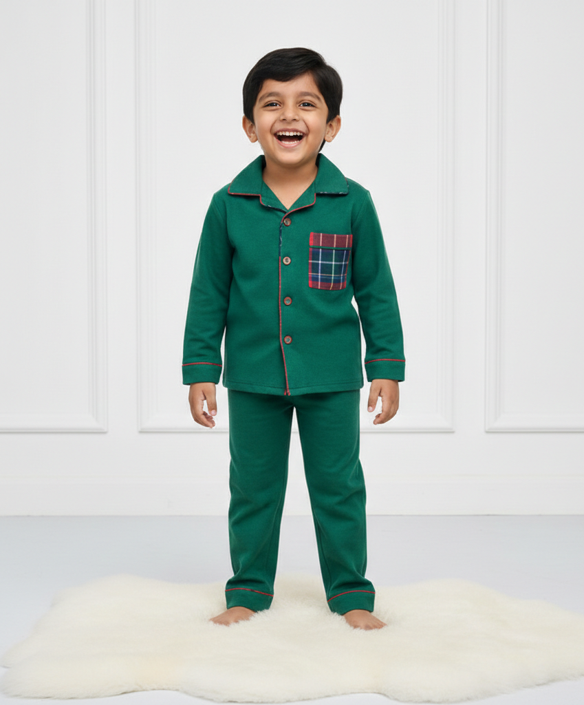 Boys Green Flannel Nightsuit with Plaid Pocket