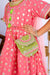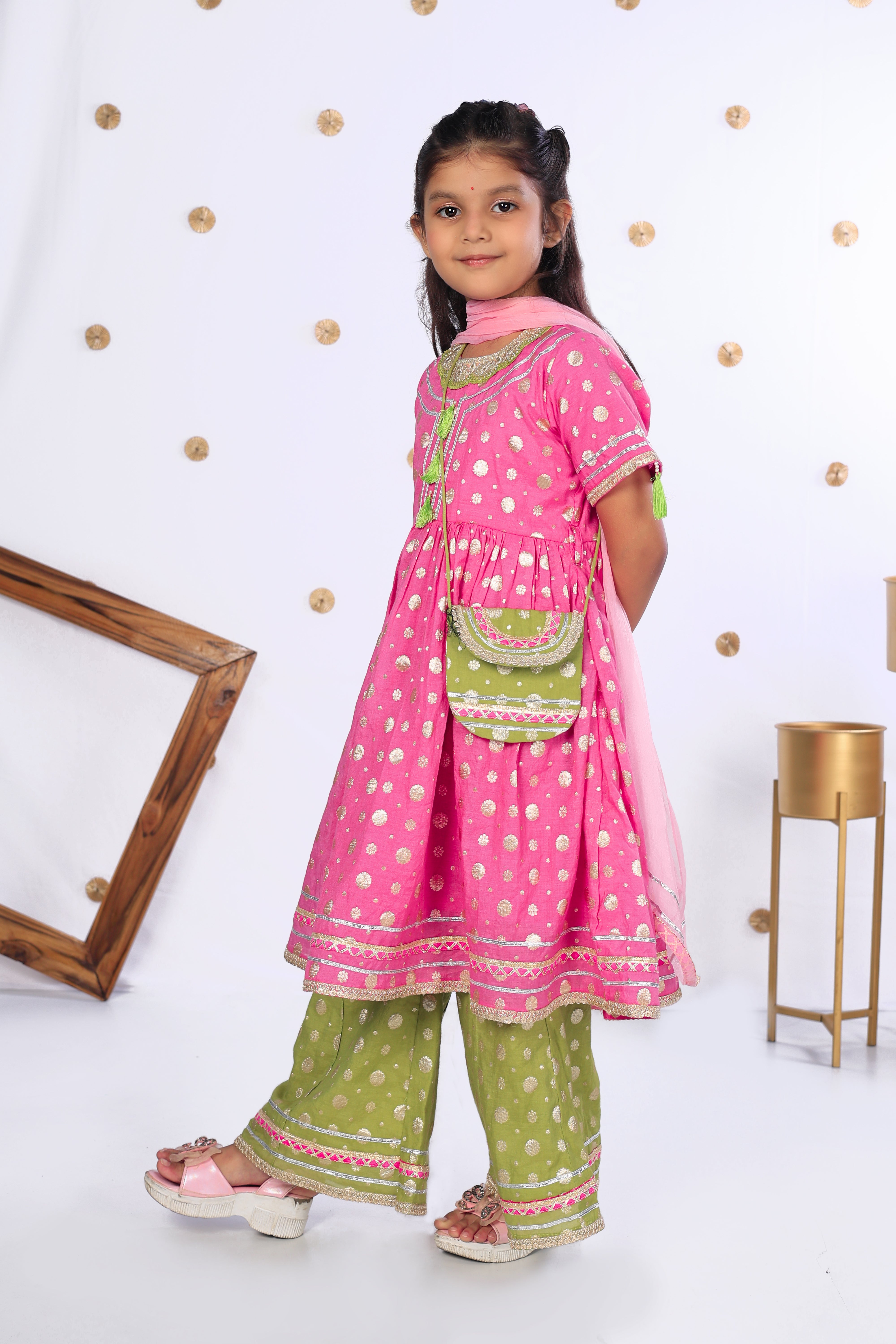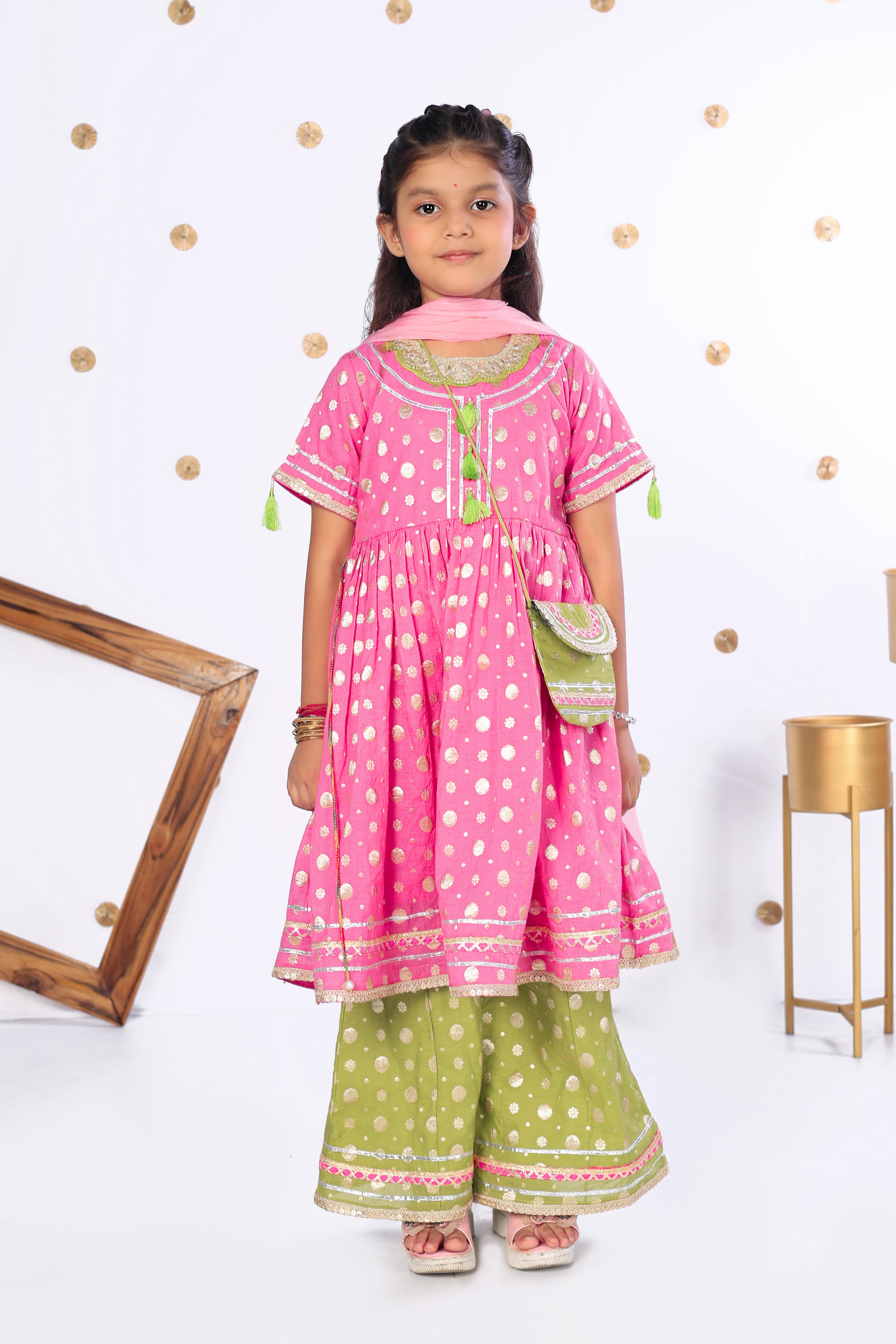 A festive delight in mul chanderi, this pink kurta set is adorned with golden butis, tassel detailing, and a contrasting green sharara. Paired with a soft dupatta and a cute potli, it’s a perfect blend of comfort and charm for little stars to shine bright this season.