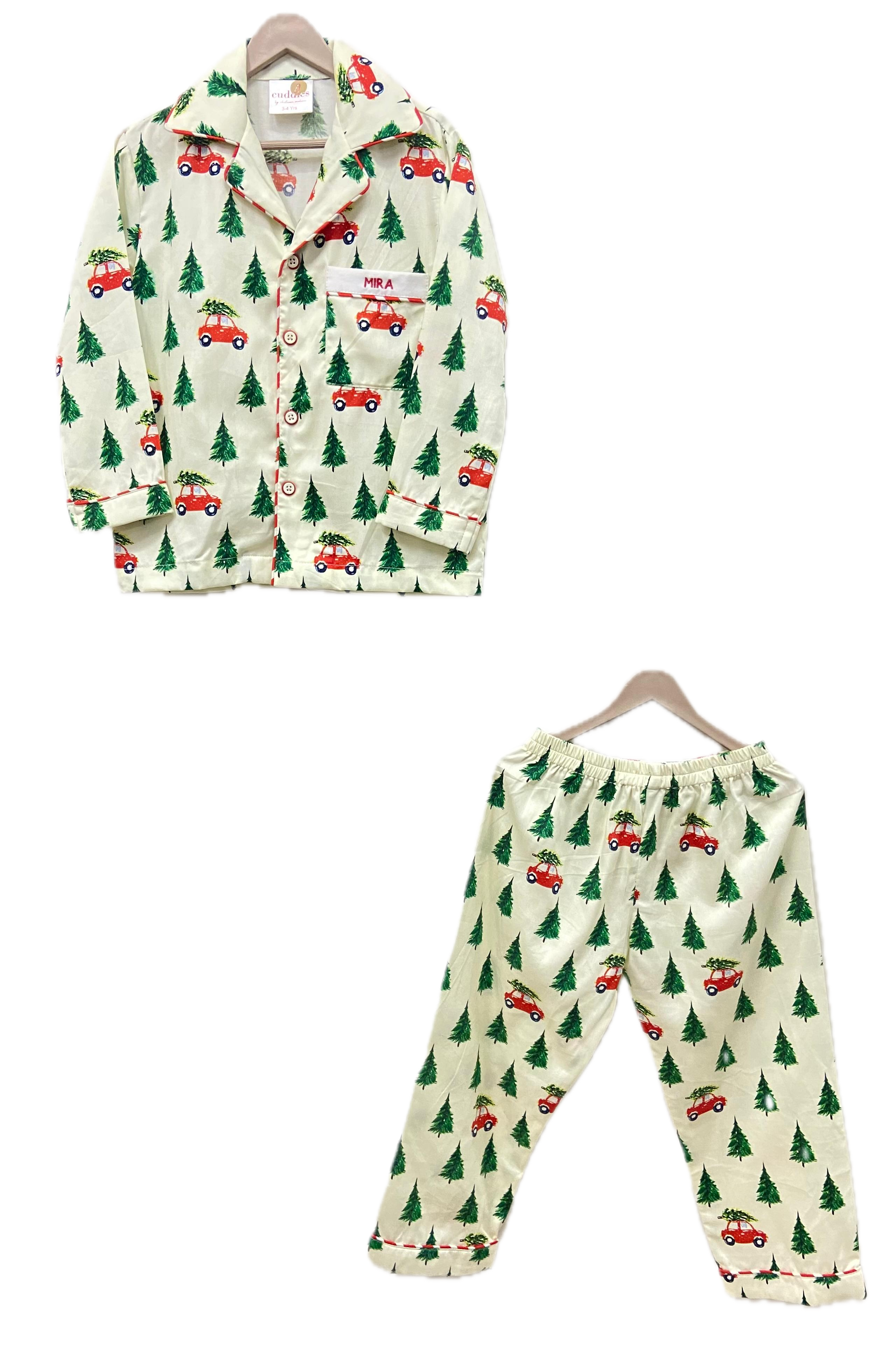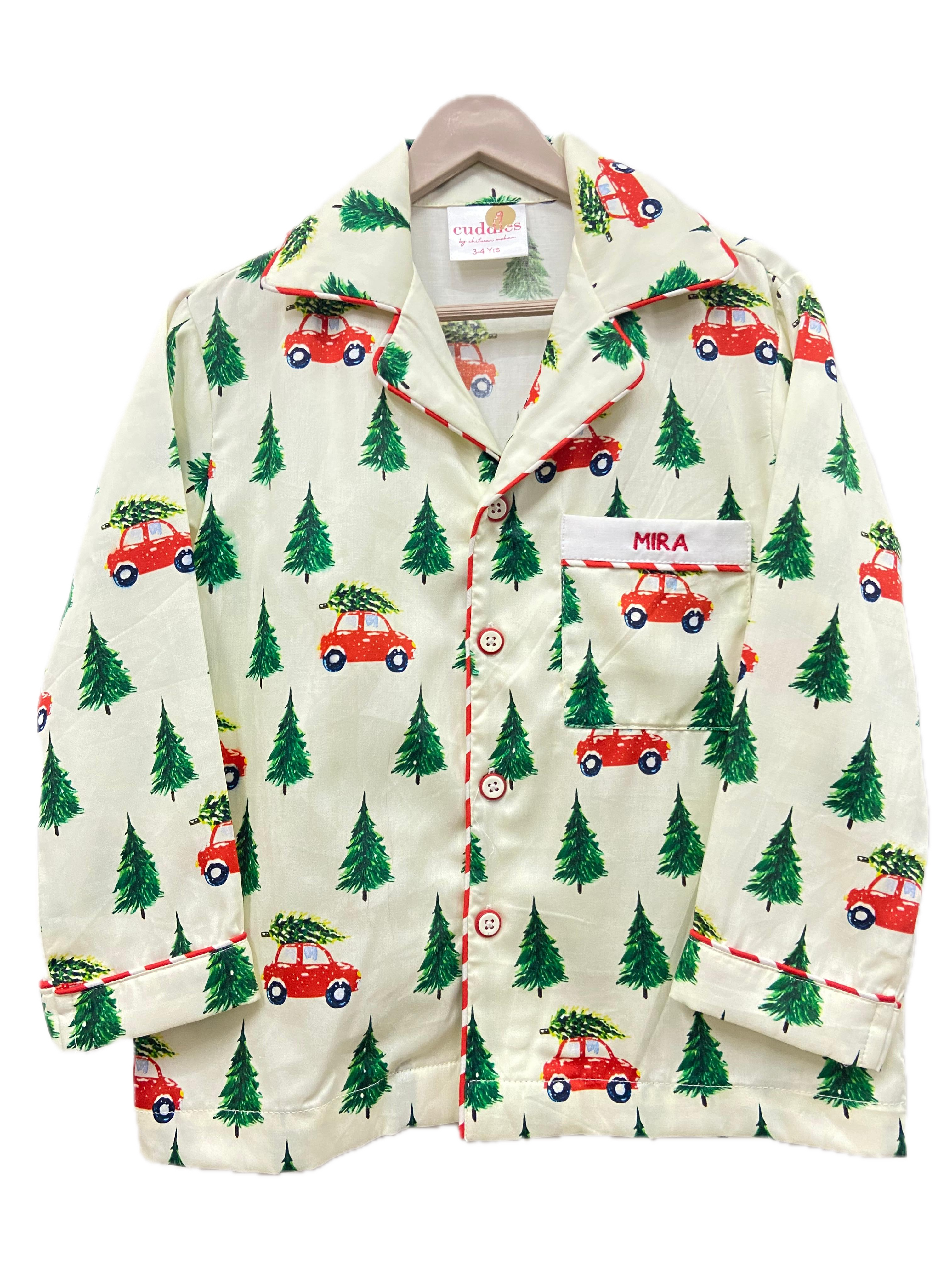 A soft, breathable cotton pajama set designed for the coziest festive nights. Featuring our cheerful red car and Christmas tree print, it’s the perfect pick for holiday snuggles, movie nights, and Christmas morning pictures.