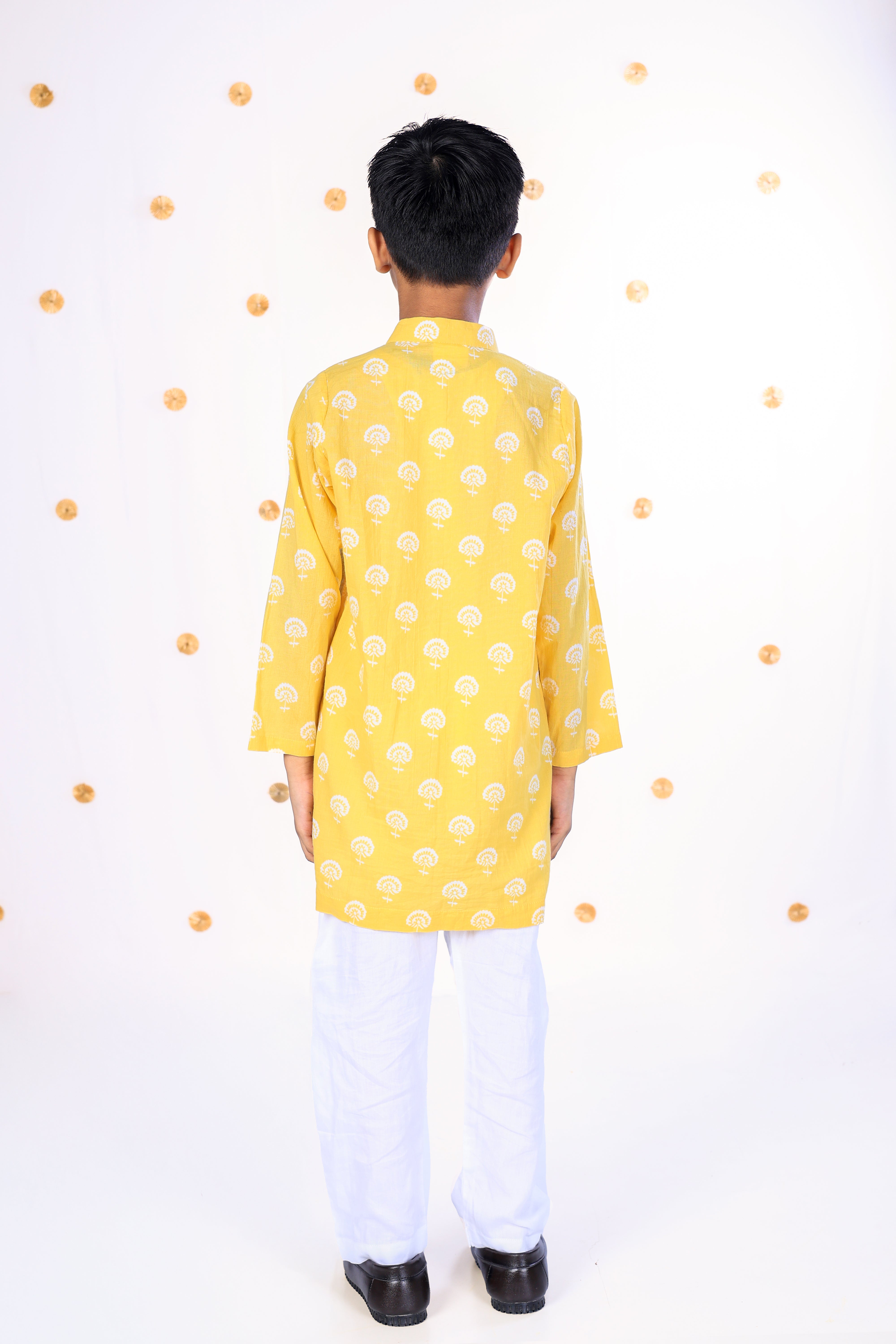 A burst of sunshine for your little one! The Kesar Gul Kurta Set comes in a radiant yellow cotton base adorned with delicate white block-printed motifs. Thoughtfully detailed with contrast pink piping and handcrafted buttons, this outfit brings together tradition and playful charm.