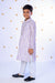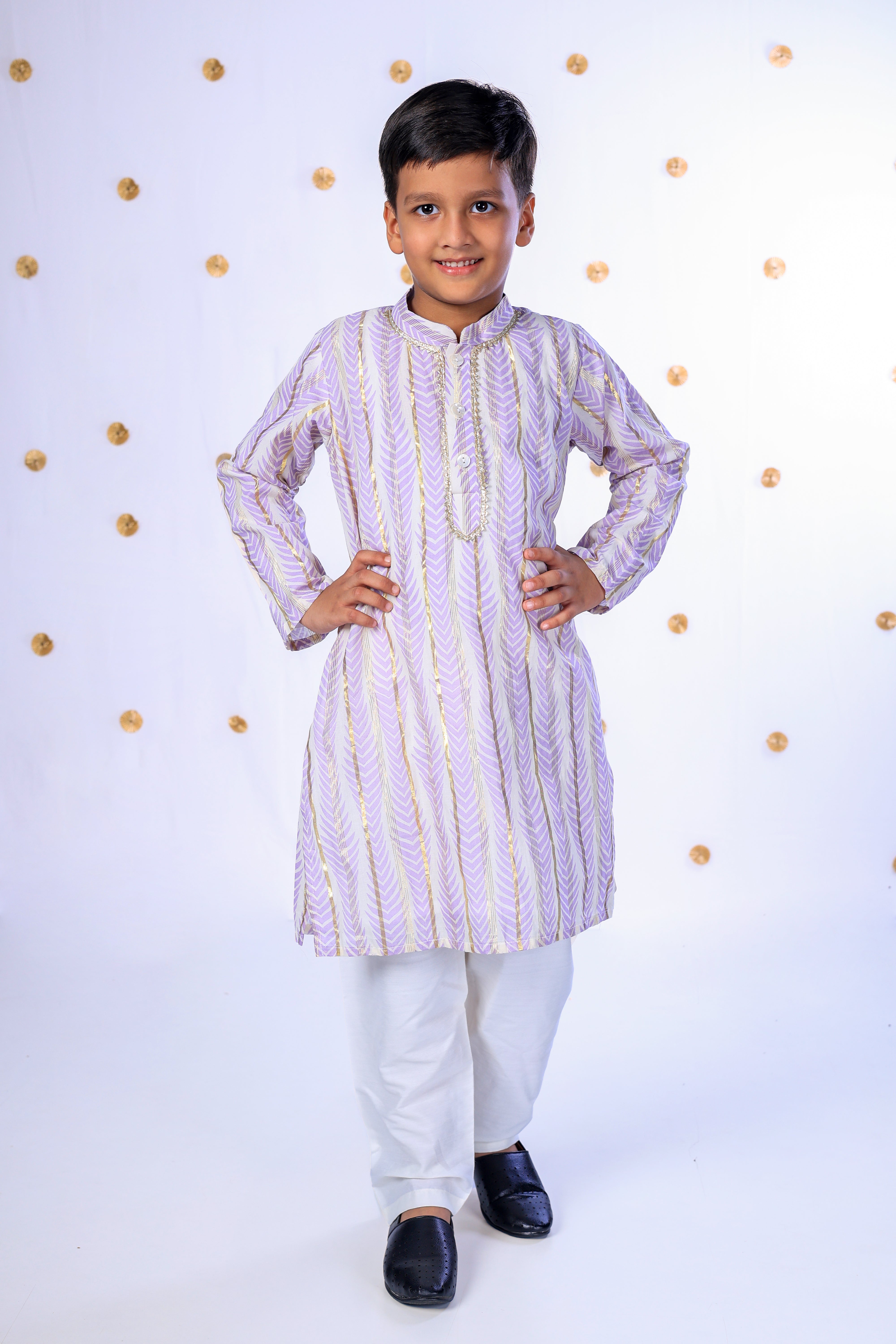 A charming lavender kurta with golden chevron detailing, paired with classic white pyjamas. This breezy cotton-silk blend makes it perfect for festive occasions, family gatherings, or playful celebrations. Designed with a neat mandarin collar and buttoned placket, it brings a touch of tradition with a modern sparkle—keeping your little one stylish and comfortable all day.