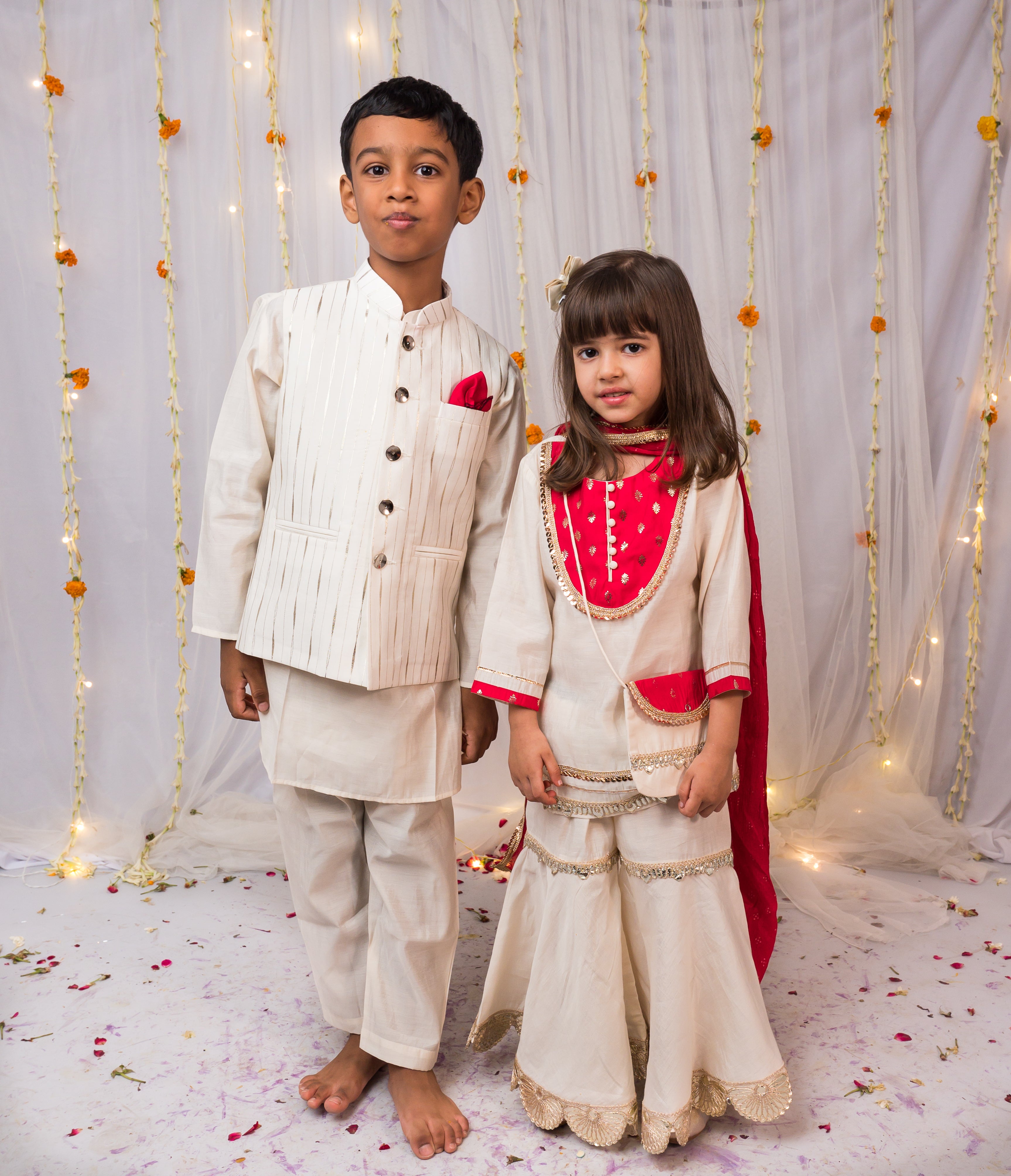Dress your little one in timeless elegance with our Boys Ivory Kurta Pajama & Striped Nehru Jacket. This beautifully crafted ensemble combines the richness of silk with the comfort of cotton, making it perfect for special occasions and festive celebrations.