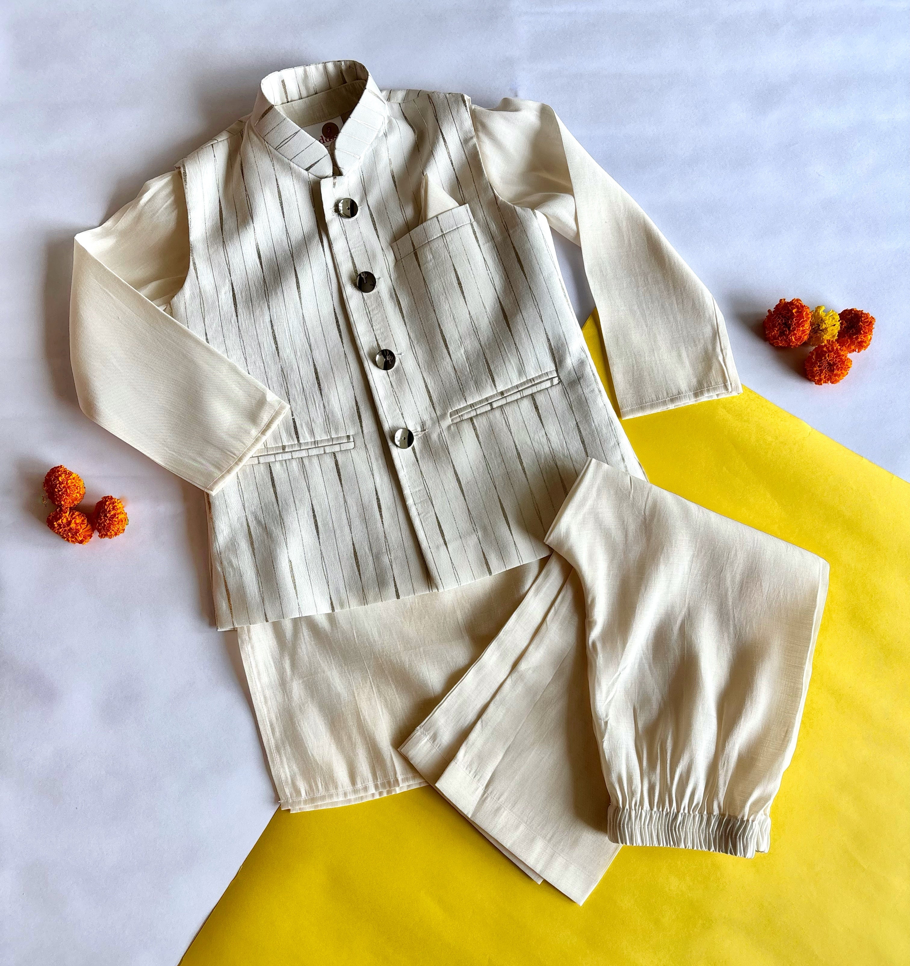 Boys Ivory Kurta Pajama & Striped Nehru Jacket
