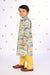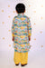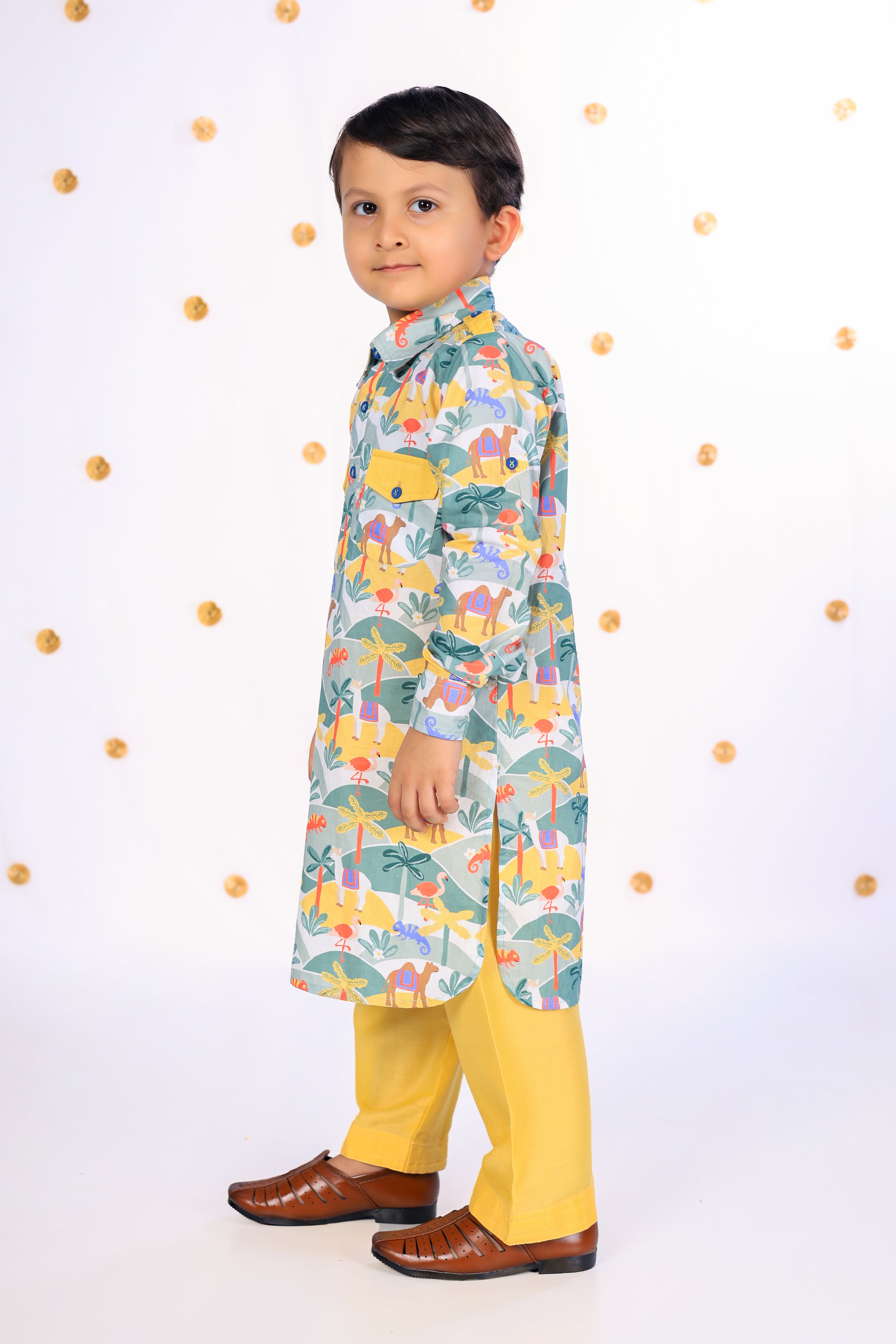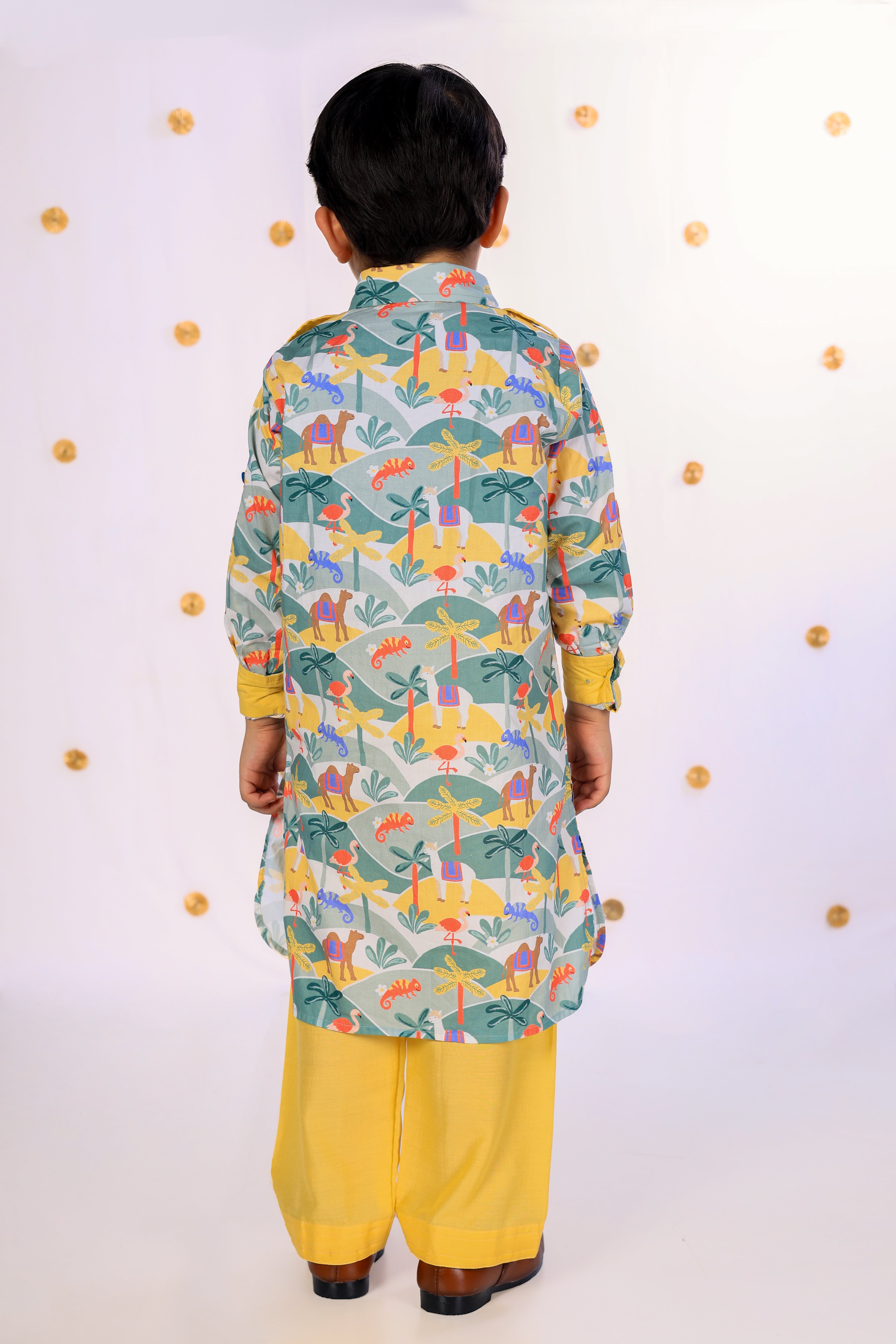 Made in soft breathable cotton, this Pathani kurta set brings the jungle alive with its colorful print of camels, flamingos, chameleons, and palms. Bright yellow detailing adds a cheerful twist, paired with matching yellow salwar. Perfect for playful celebrations, festive occasions, or a day full of little adventures.