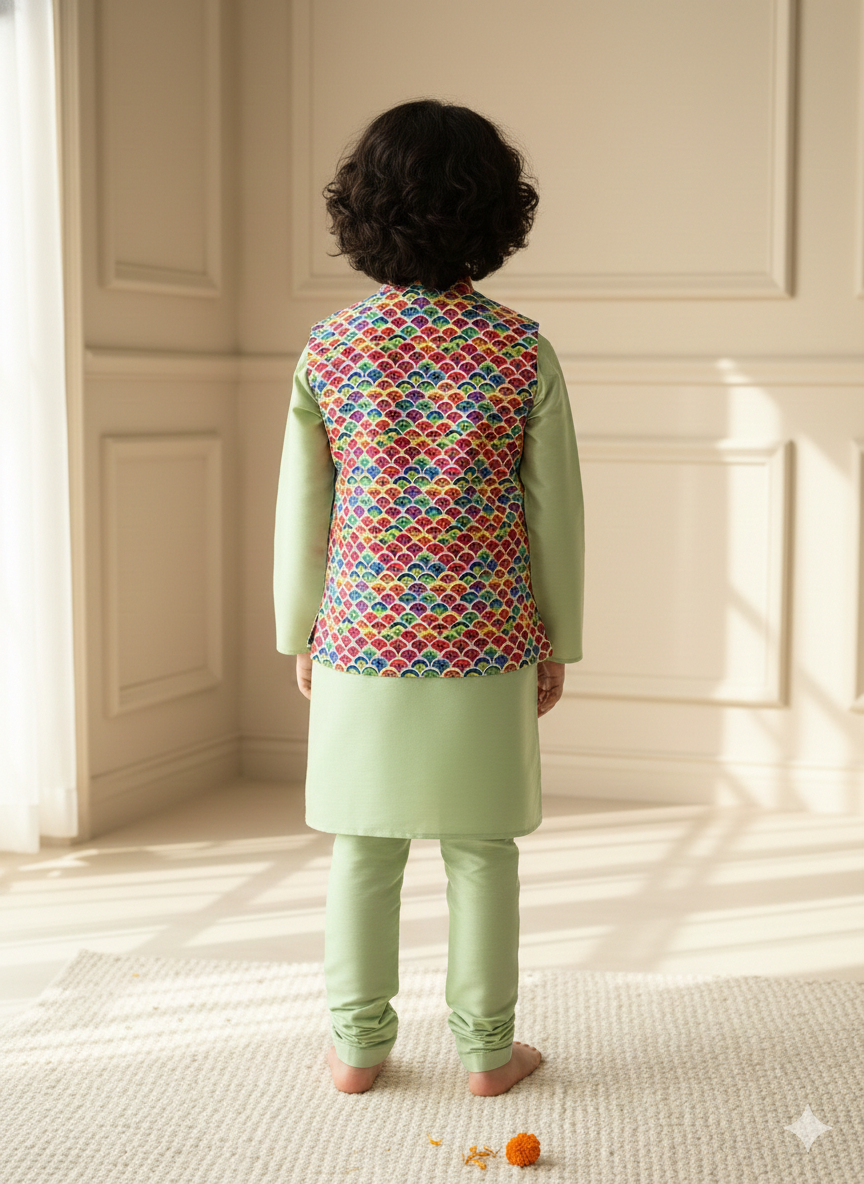 Boys Sage Green Nehru Jacket & Scallop Print Kurta Set