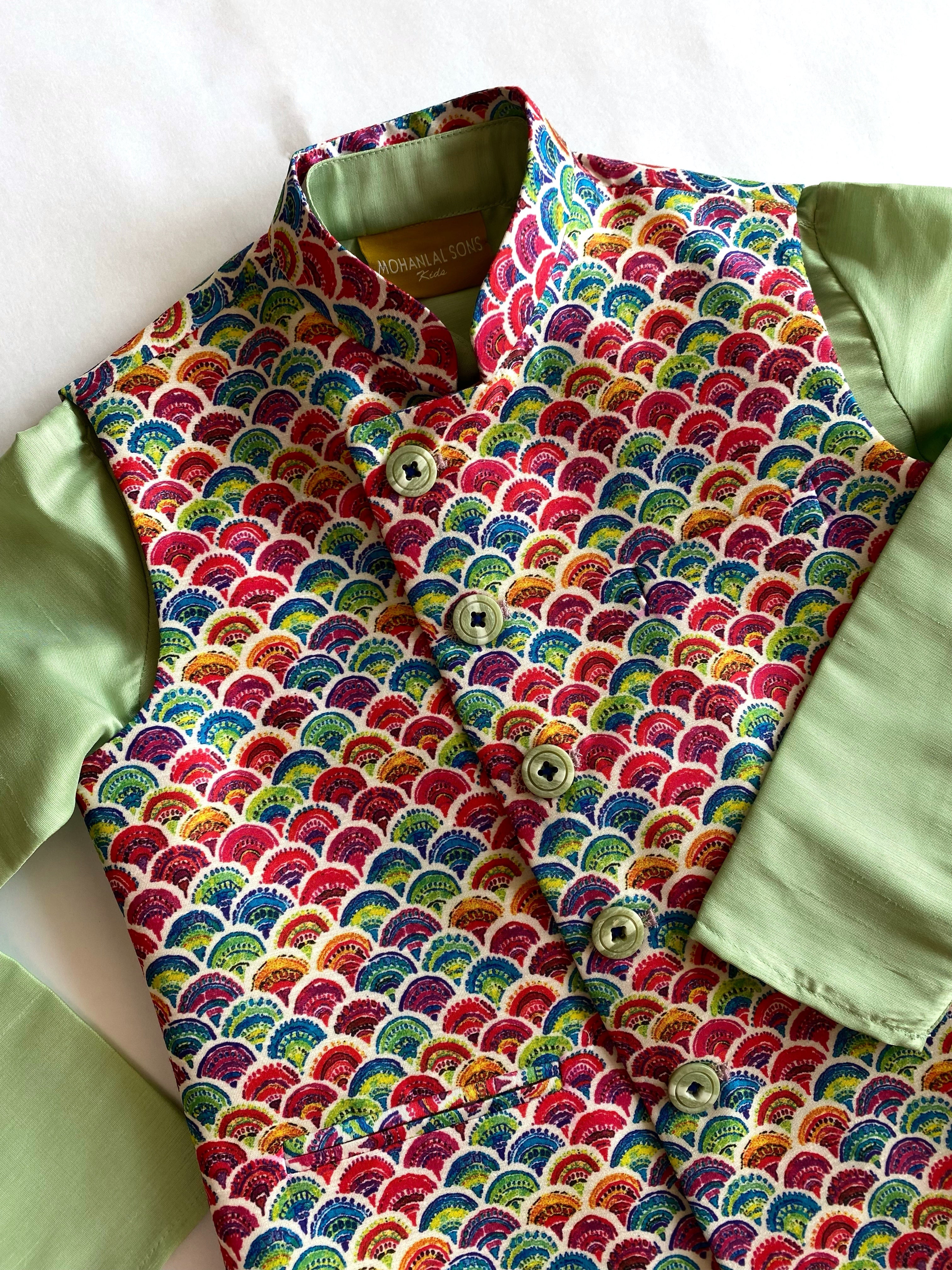 Ideal for weddings, cultural events, and festive celebrations, the "Color Splash" Printed Jawahar Jacket Set is a unique blend of tradition and contemporary flair. Its vivacious design ensures that your little one stands out with confidence and charm on every special occasion.