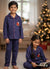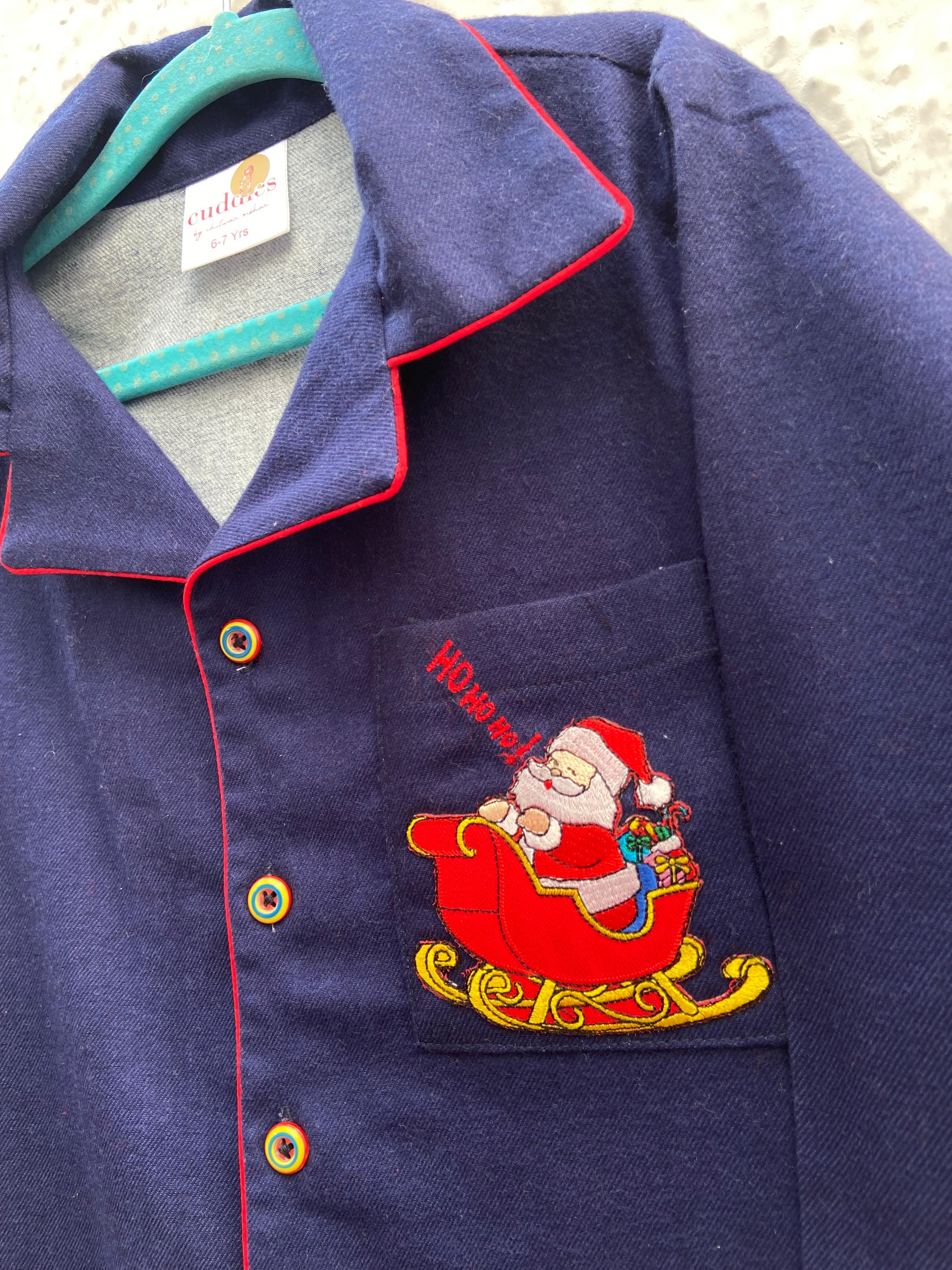 Crafted from premium, breathable cotton, this long-sleeved night suit promises a cozy, itch-free night of sleep, perfect for reading bedtime stories or waiting for Santa. The rich navy blue fabric is accented with contrasting red piping, and the chest pocket features an adorable Santa and Sleigh embroidery.