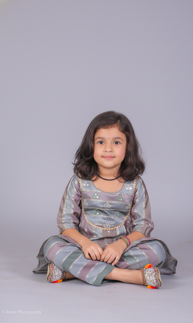 Let your little one dazzle in this beautiful silk kurta and pants set, featuring fun mirror work hand embroidery on the yoke! The soft, shiny silk fabric adds a touch of magic, while the sparkling mirror details make it perfect for festive moments. Paired with comfy pants, this outfit is stylish yet easy to wear, making it just right for special occasions, family celebrations, or parties.